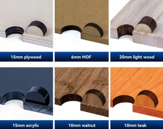 Режущий материал: все виды древесины (в том числе орех, вишня и другая древесина высокой плотности), МДФ, акрил, картон, бамбук, некоторые пластиковые плиты, кожа, печатные платы