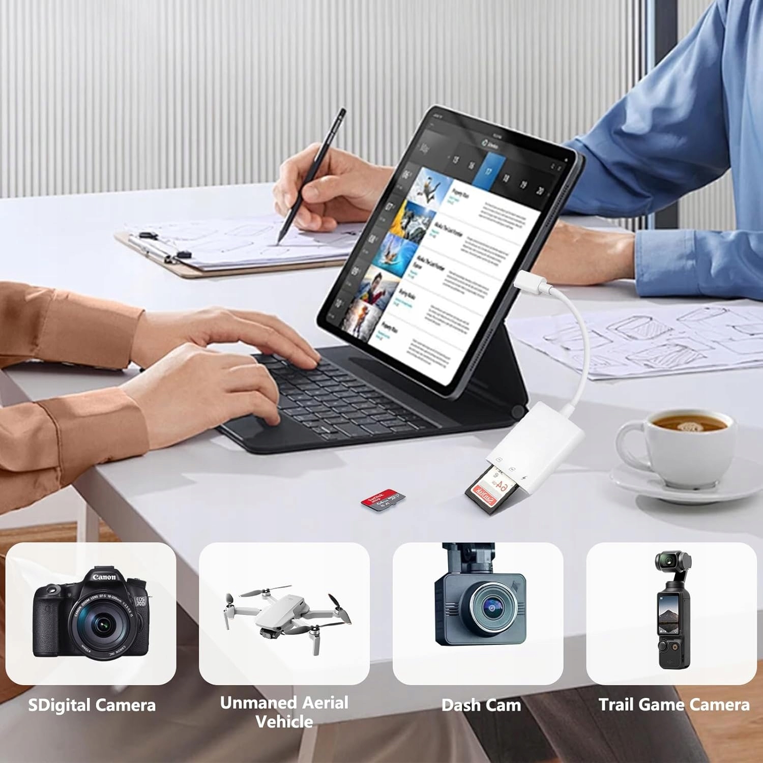 Адаптер карты памяти Vonxite для iPhone поддерживает несколько устройств, таких как iPhone 14/13/12 Pro Max/12 Pro/12 Mini/12/11 Pro Max/11 Pro/11/11/XS Max/XS/XS/XR / X/8/8 Plus/7/7 Plus/6S/6S Plus и iPad и т. д. Это устройство чтения карт iPhone может удовлетворить ваши потребности в различных ситуациях и позволяет передавать фотографии, видео, файлы и т. д. в любое время и в любом месте.
