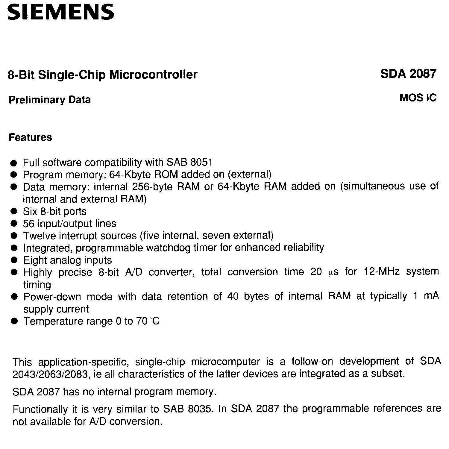 Микроконтроллер SDA 2087N, 8 бит, 12 МГц