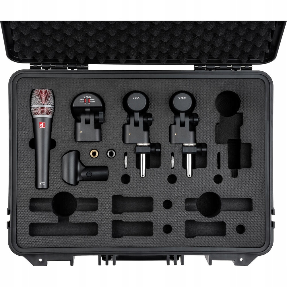 se Electronics V Standue Standard состоит из одного V -Kick Microphone в штаб -квартире, два V -бита и V -Claps на объем и один V7 x до малого барабана. Все микрофоны и аксессуары надежно упакованы в твердый, характерный пластиковый чемодан, в котором есть место для трех дополнительных микрофонов и для любимого микрофона Hi-Hat.