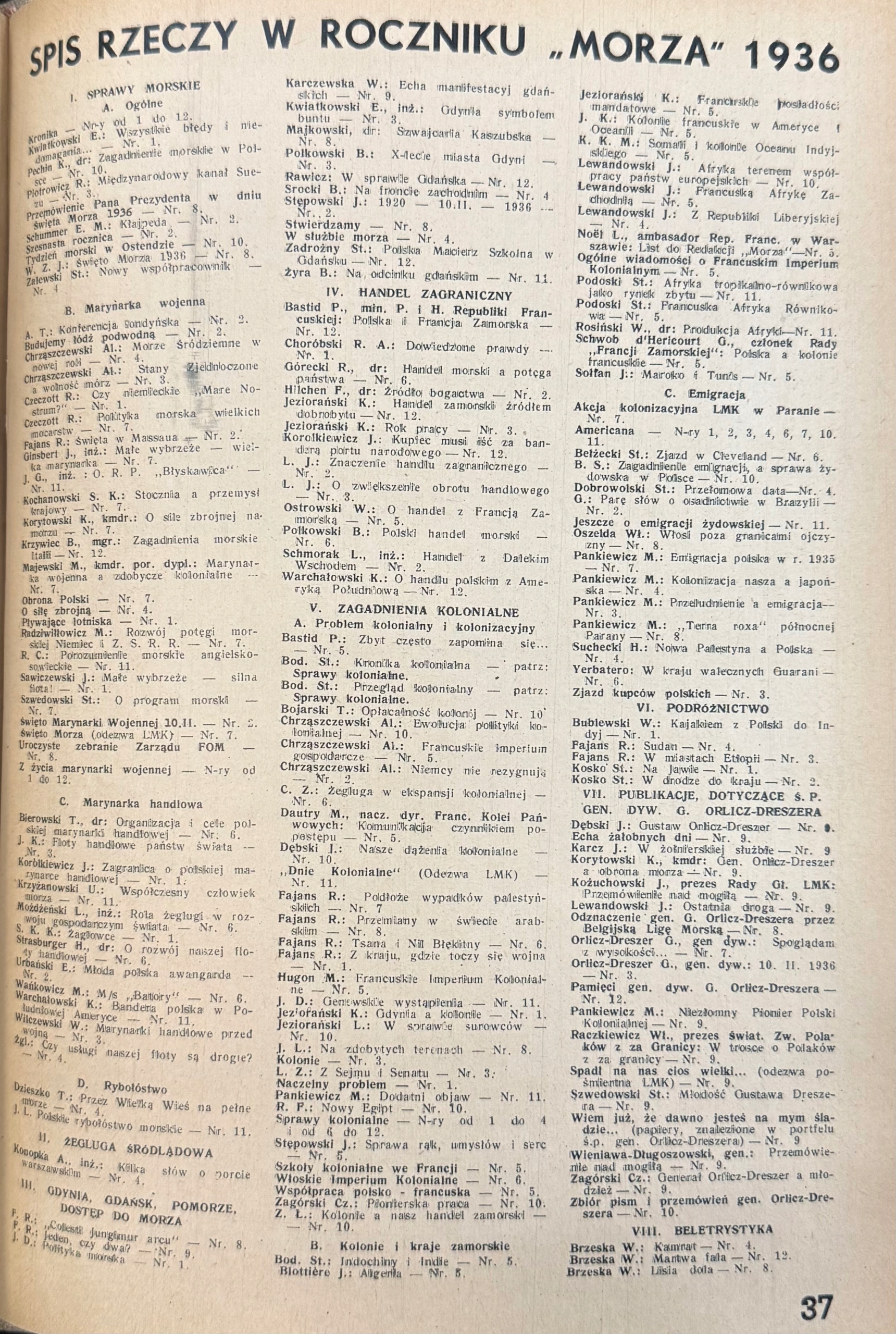 На страницах моря появилась статьи ведущих журналистов и экспертов эпохи, таких как Абрамовски, Добозиньский, Косзутски, Шибор-Рилски или Зильински. Были повышены темы, связанные с развитием Gdynia, торгового флота, морской и внутренней экономики, а также польской колониальной политики. Особое место было занято вопросами баланса внешней торговли, таможенной политики и участия Польши в колониальных выставках.