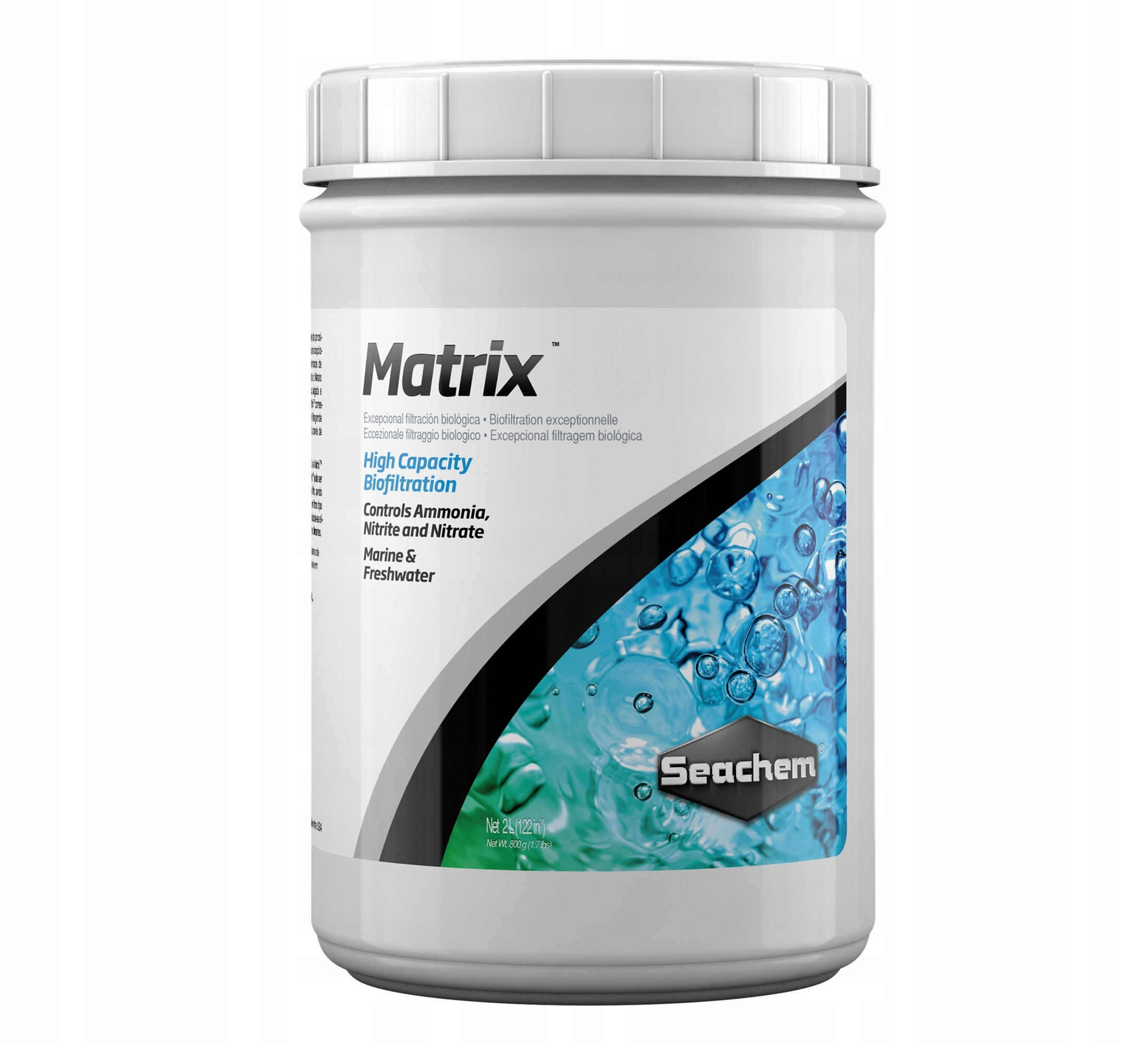 Матрица — фильтрующий материал высокой пористости, обеспечивающий эффективное удаление азотистых продуктов обмена. Диаметр отдельного зерна составляет около 10 мм, а их общая поверхность в одном литре — более 700 м2, что соответствует 170 л пластиковых биошариков. Благодаря своей структуре Matrix позволяет микроорганизмам селиться как в более мелких, так и в более глубоких частях пор. Кроме того, они имеют оптимальный размер для нитрифицирующих и денитрифицирующих бактерий. Это позволяет одновременно удалять нитраты, нитриты и аммиак. Матрица химически инертна и не разлагается. Его не нужно заменять. Поскольку большинство бактерий обитает внутри пор, при необходимости гранулы можно промывать. Matrix подходит для использования во всех типах фильтров.