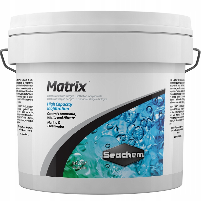 Диаметр одного зерна составляет около 10 мм, а их общая поверхность в 1 литре — более 700 м2, что соответствует 170 л пластиковых биошариков. Благодаря своей структуре Matrix позволяет микроорганизмам селиться как в более мелких, так и в более глубоких частях пор. Кроме того, они имеют оптимальный размер для нитрифицирующих и денитрифицирующих бактерий. Это позволяет одновременно удалять: нитраты (NO3), нитриты (NO2) и аммиак (NH4). Матрица химически инертна и не разлагается. Его не нужно заменять. Поскольку большинство бактерий обитает внутри пор, при необходимости гранулы можно промывать. Matrix подходит для использования во всех типах фильтров.