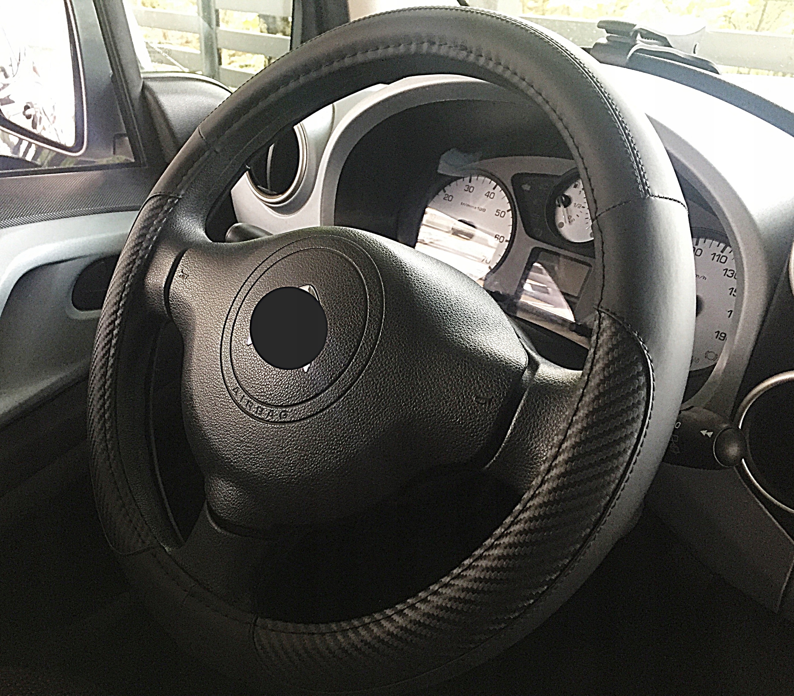 Чехол на руль из высококачественных материалов (экокожа в сочетании с имитацией карбона).