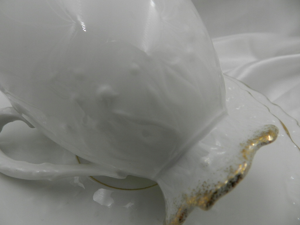 Ажурная ручка чашки, неровный край блюдца и тарелки и красивая подставка, на которой поставлена чашка, и все это, подчеркнутое нежной и тонкой позолотой, придает экспонату вид чрезвычайно красивый и чрезвычайно нежный и элегантный.