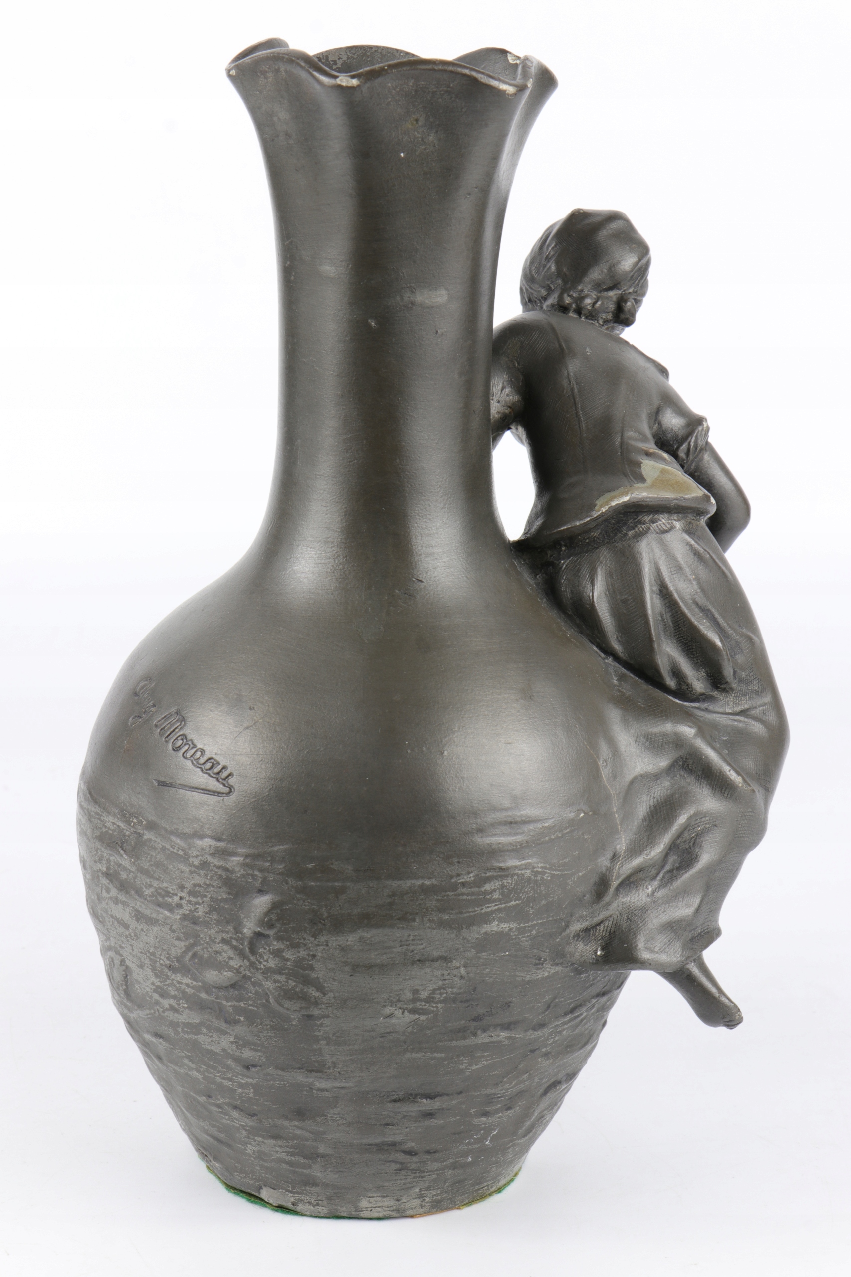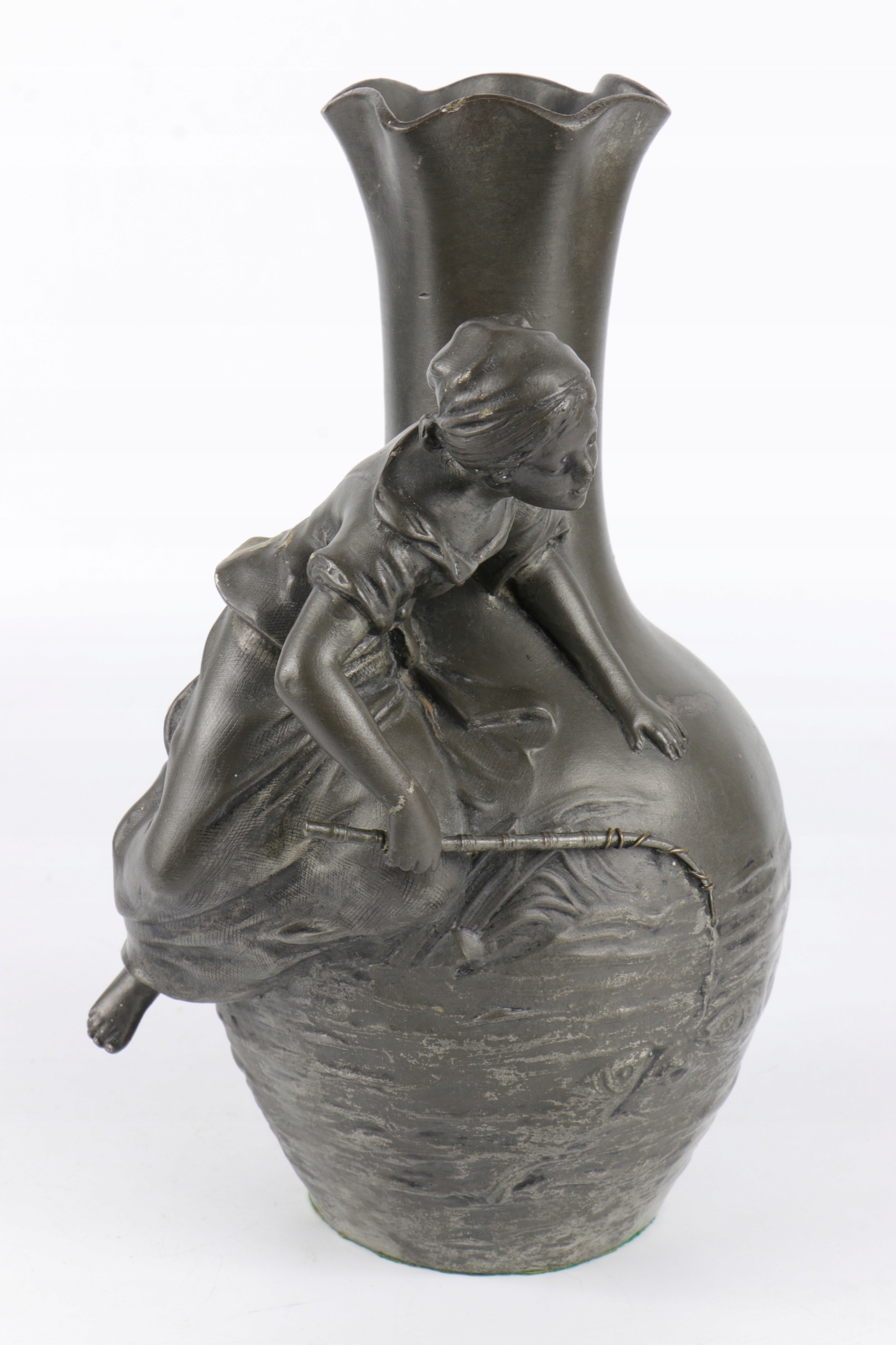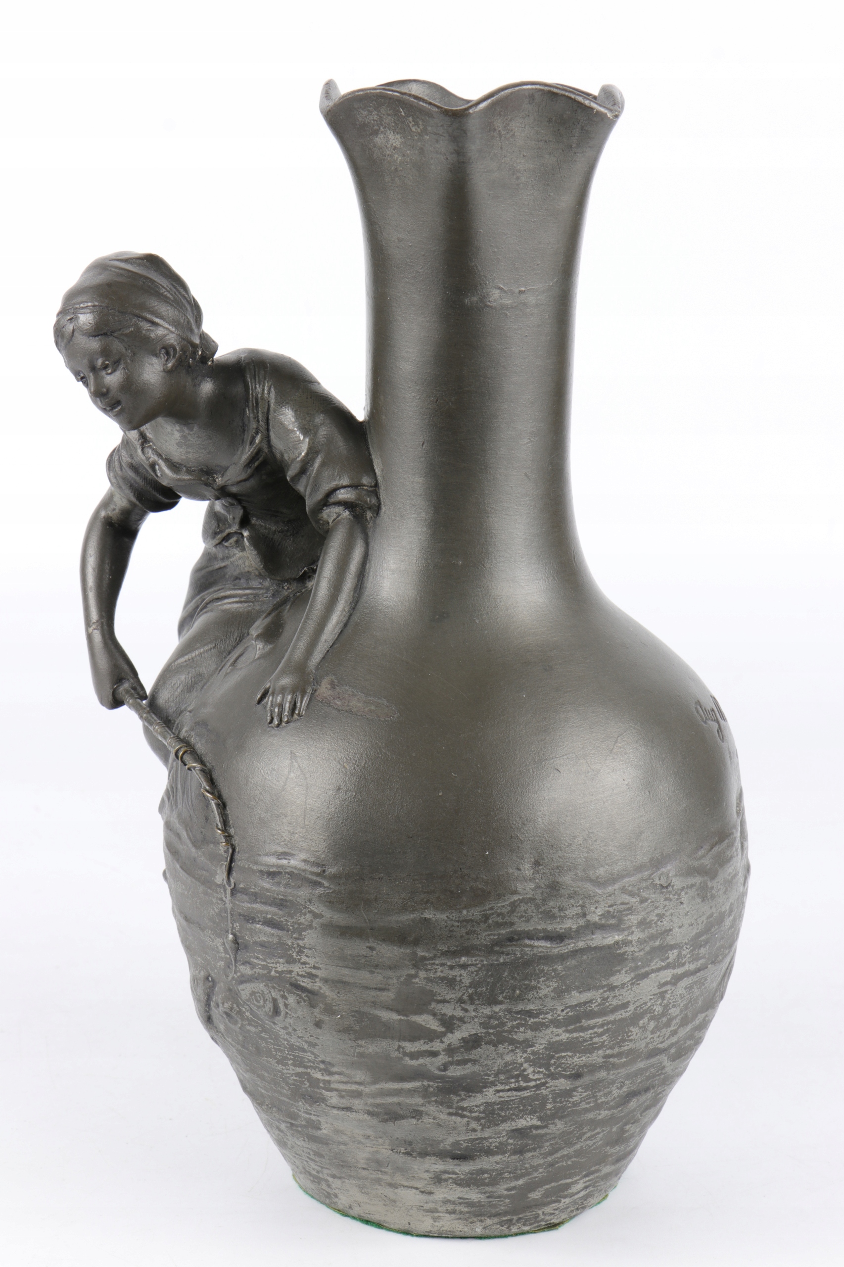 Арт -модерн фигуральная ваза подписана с именем Август Моро. Объект прекрасно смоделирован. Фигура молодой женщины с рыбацкой стержней, установленной на животе вазы, стилизованной на поверхность озера. Красивое французское отделение. Подписано у основания с листовым знаком "E.Fres" и оловом. На дне чисел литейного завода, сделанного вечными чернилами.