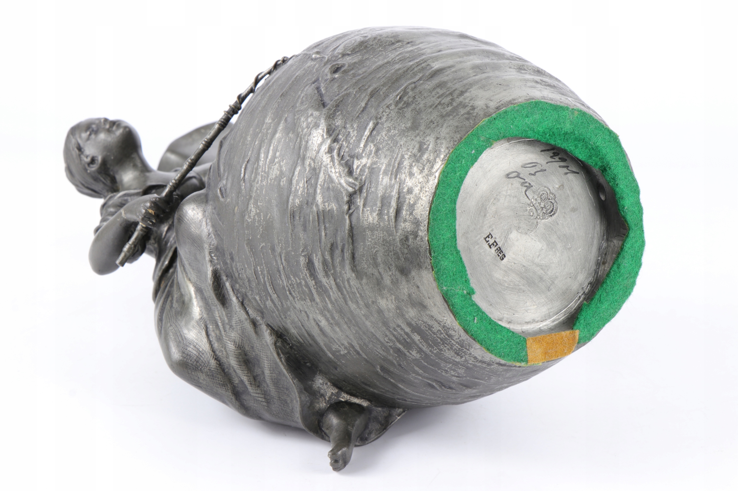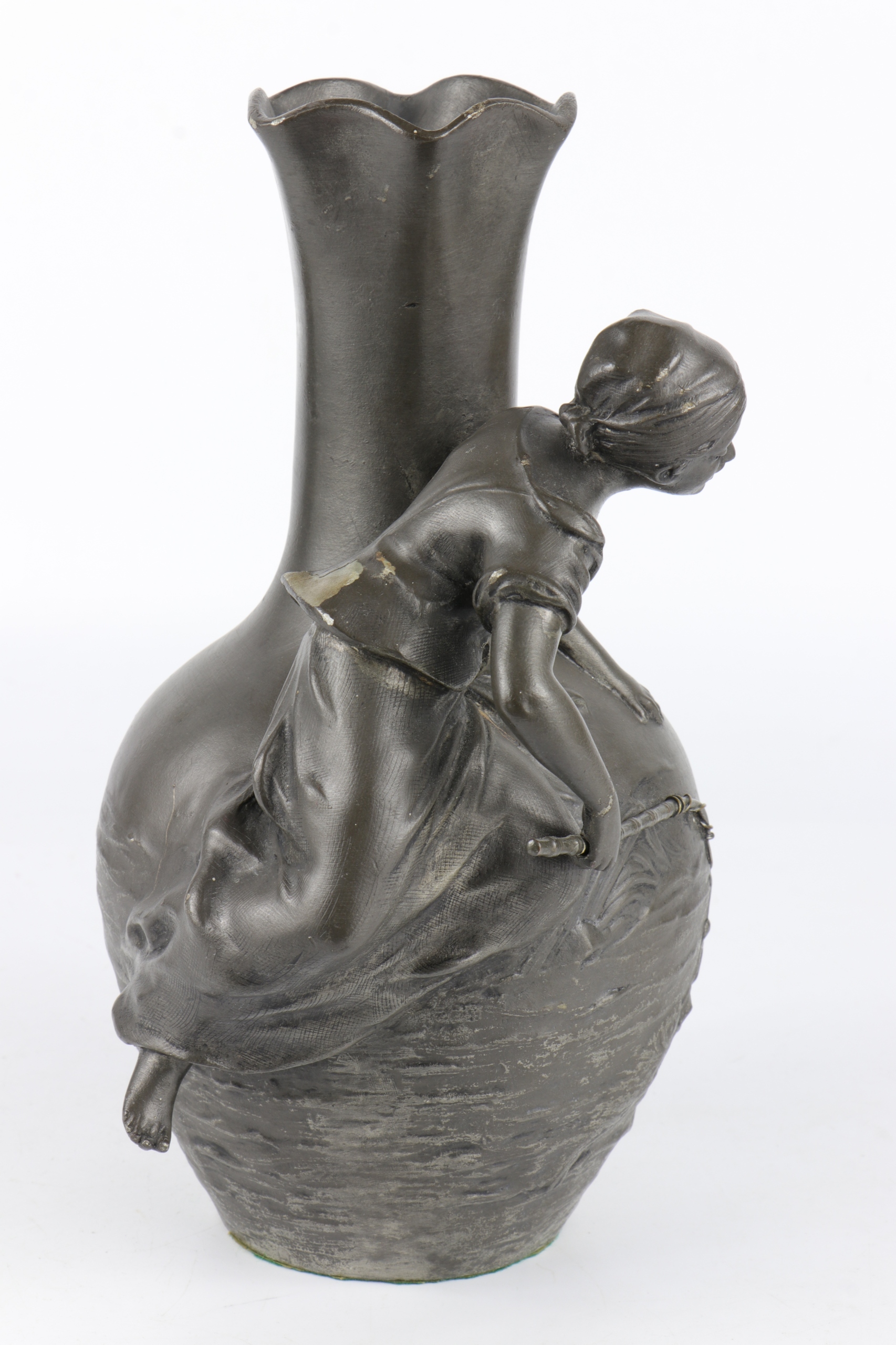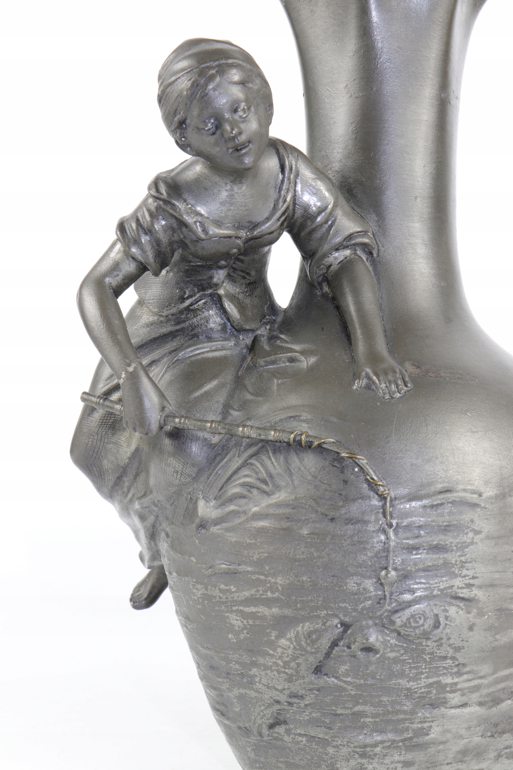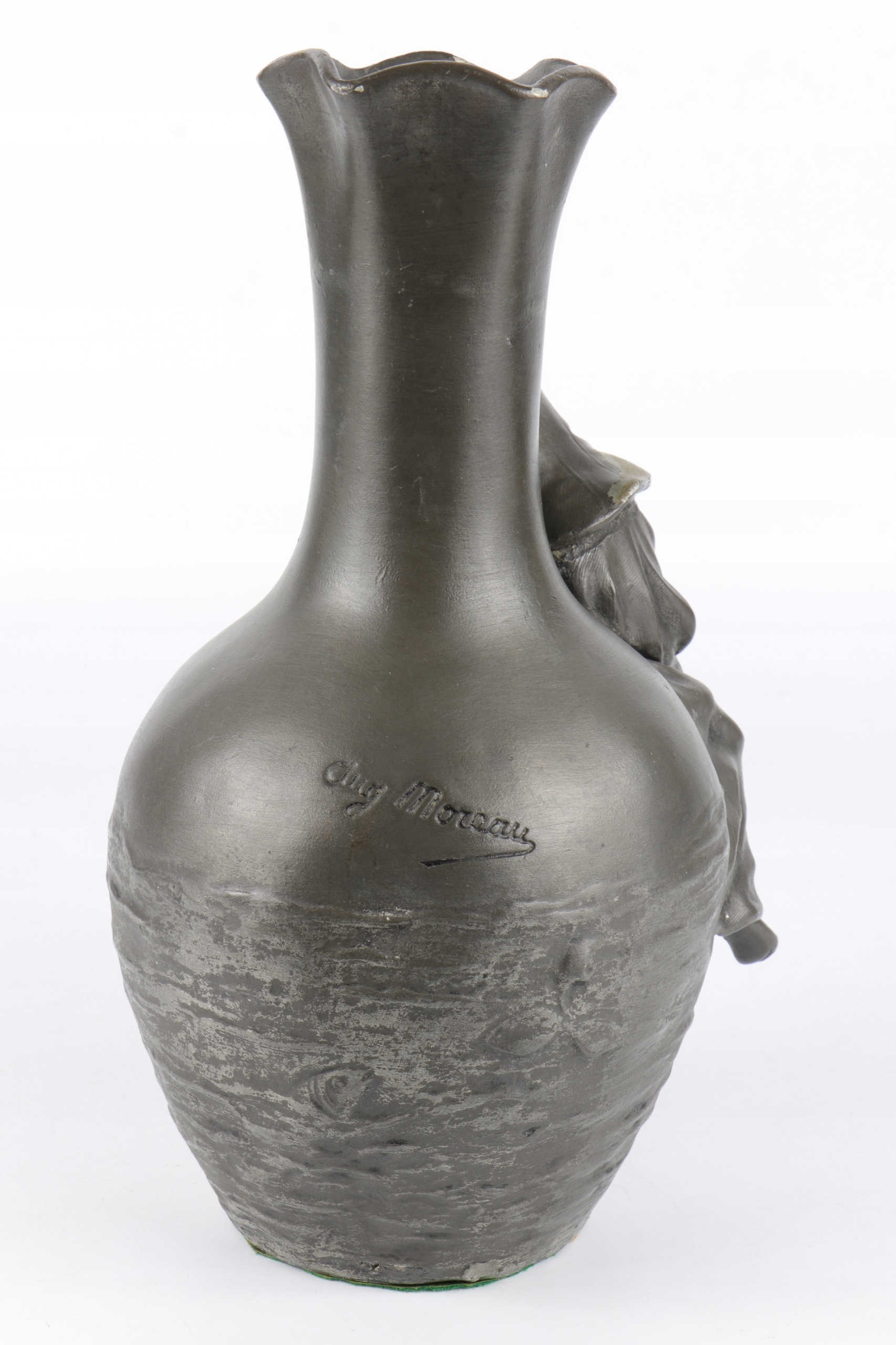 Арт -модерн фигуральная ваза подписана с именем Август Моро. Объект прекрасно смоделирован. Фигура молодой женщины с рыбацкой стержней, установленной на животе вазы, стилизованной на поверхность озера. Красивое французское отделение. Подписано у основания с листовым знаком "E.Fres" и оловом. На дне чисел литейного завода, сделанного вечными чернилами.