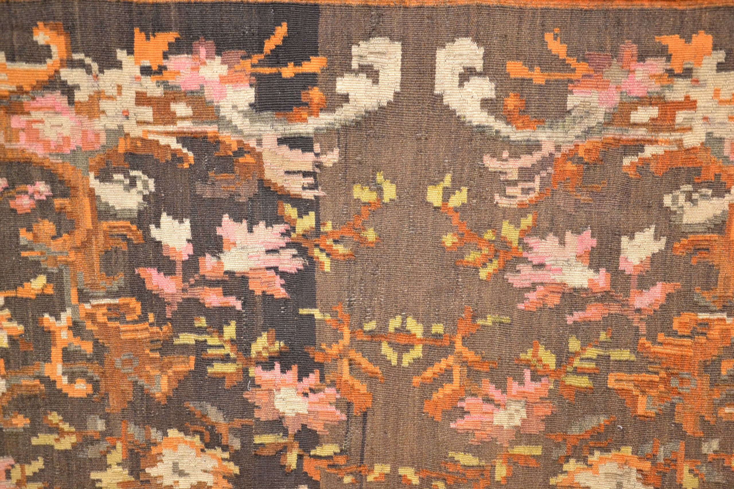 Высококачественный и исключительно красивый, оригинальный старинный (около 100 лет) восточный килим - сотканный вручную, изготовленный из овечьей шерсти высшего качества на шерстяной основе и окрашенный натуральными растительными красителями. Восточный дизайн (богато украшен растительным орнаментом) и гармонично контрастирующие цвета (эффектный абра) позволяют прекрасно смотреться как на полу, так и на стене.