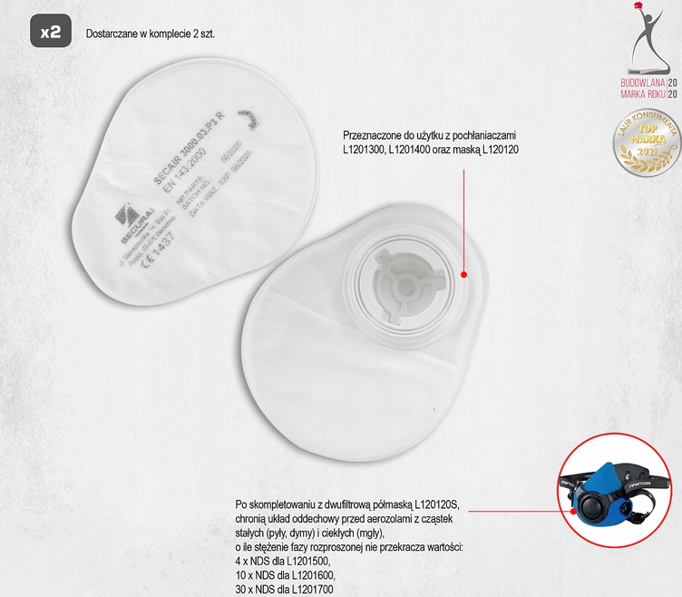 Фильтры SECAIR 3000.02 P2 R защищают органы дыхания от микрочастиц и аэрозолей, твердых частиц (пыль, дым) и жидких частиц (туманы). ), если только концентрация дисперсной фазы не превышает значения 10 x NDS (Высокодопустимая концентрация).