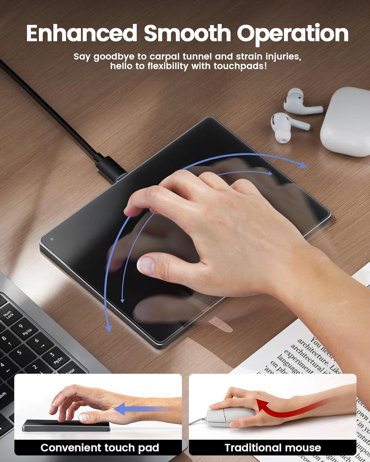 Тачпад имеет гладкую стеклянную поверхность и прочную металлическую основу, что обеспечивает элегантный внешний вид и высокую прочность. Ультратонкая форма гарантирует комфорт даже в течение многих часов работы, идеально подходит для программистов, графических дизайнеров и офисных пользователей.