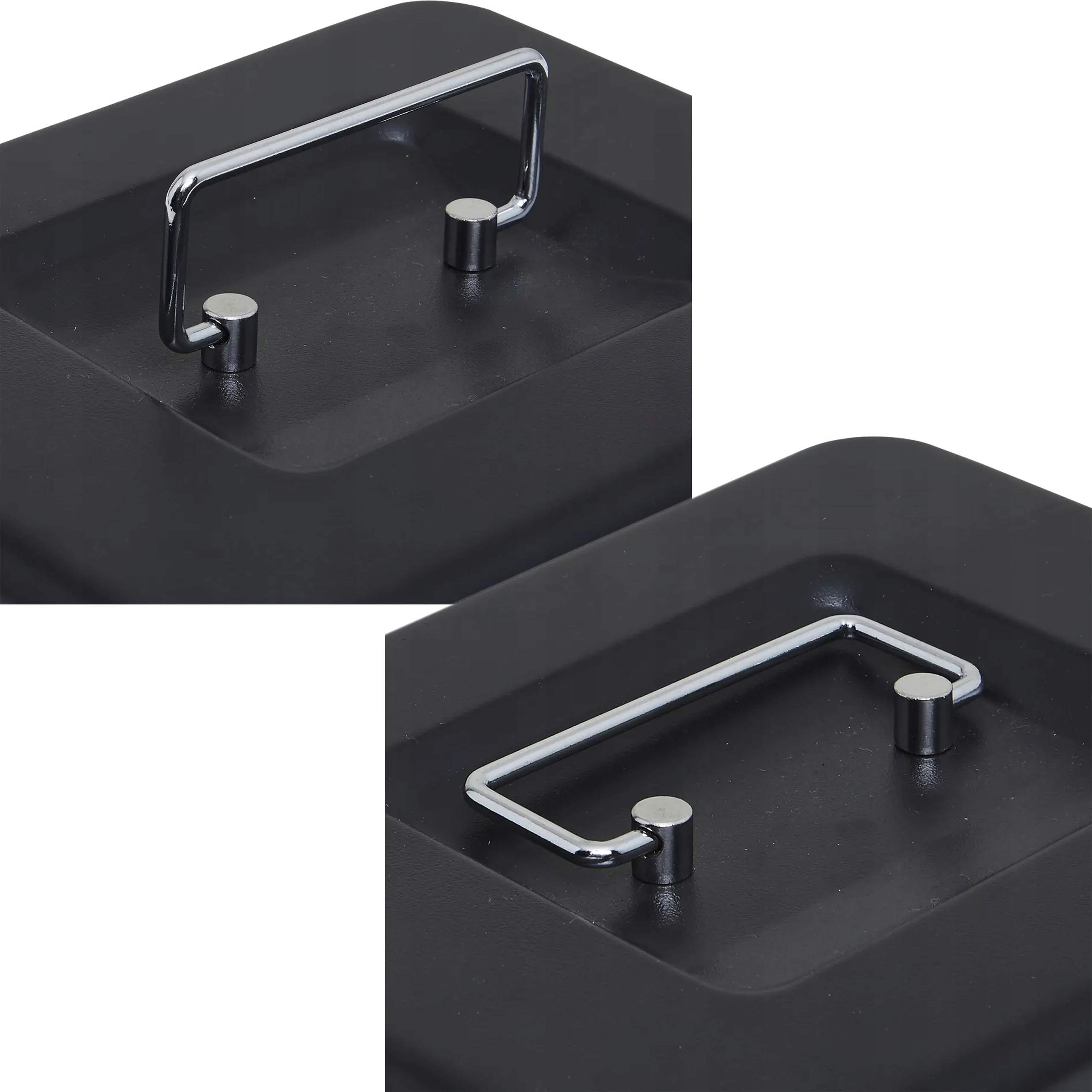 Кассета изготовлена из металла, покрыта с порошковым лаком. Внутри коробки находится вкладыш для монет с выдвижными отделениями из пластика. Он оснащен практичной металлической ручкой, которая прячется в углублении в верхней стенке корпуса. Коробка хорошо послужит защитой ценных и ценных вещей от кражи. Идеально подходит для дома, офиса, работы.