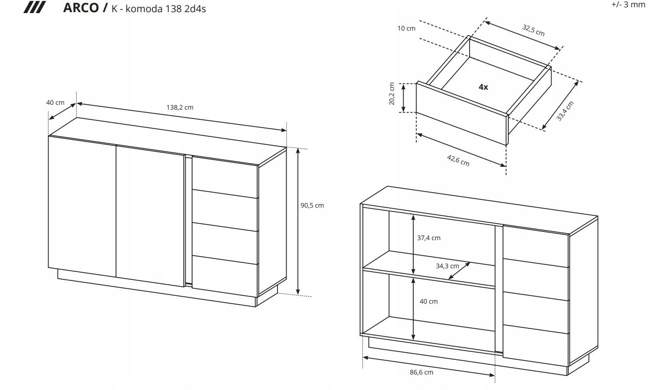- Комод 2D4S - 138,2 см/90,5 см/40 см