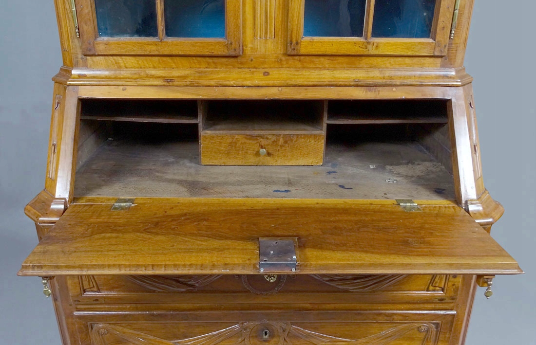 Приставка с двумя застекленными дверцами, волнистыми вверху, с изогнутыми монтировками с цветком посередине. Полоса между ними украшена подвесными цветочными чашечками. Внутри две полки, обтянутые тканью, как и задняя часть мебели. Каждый запираемый элемент имеет стальной, ручной ковки, накладной замок, а для соединения деревянных элементов использован дюбель.