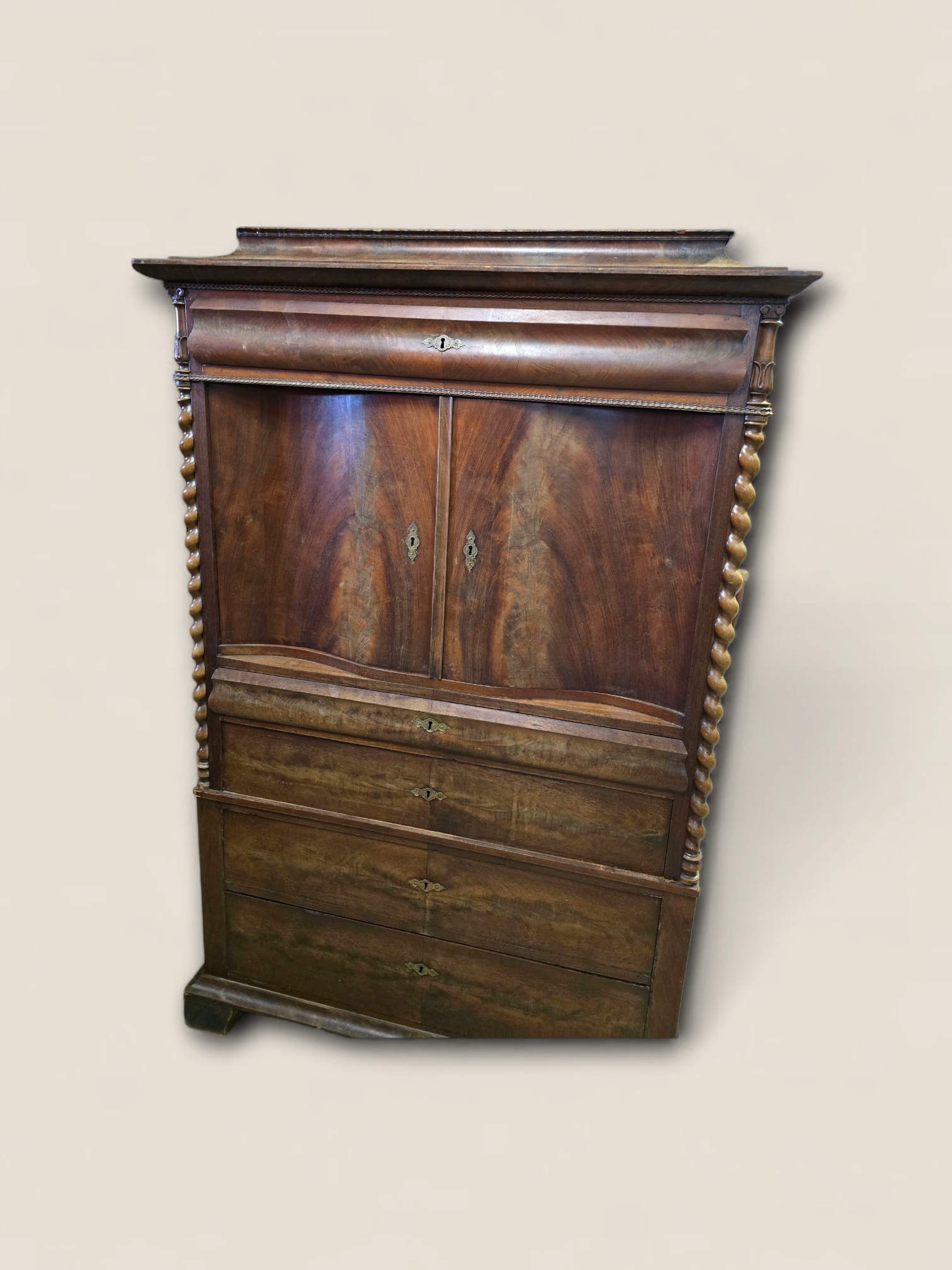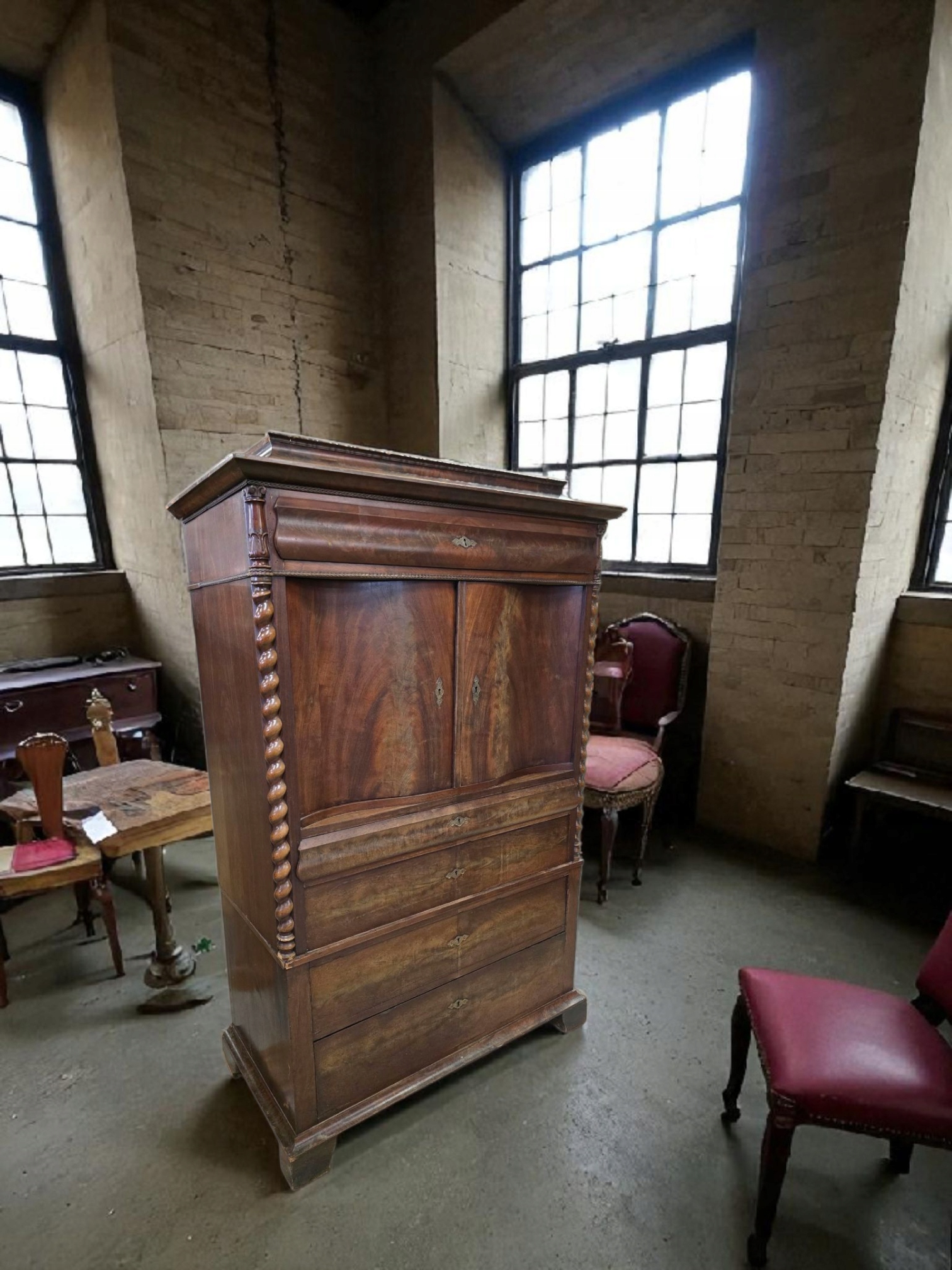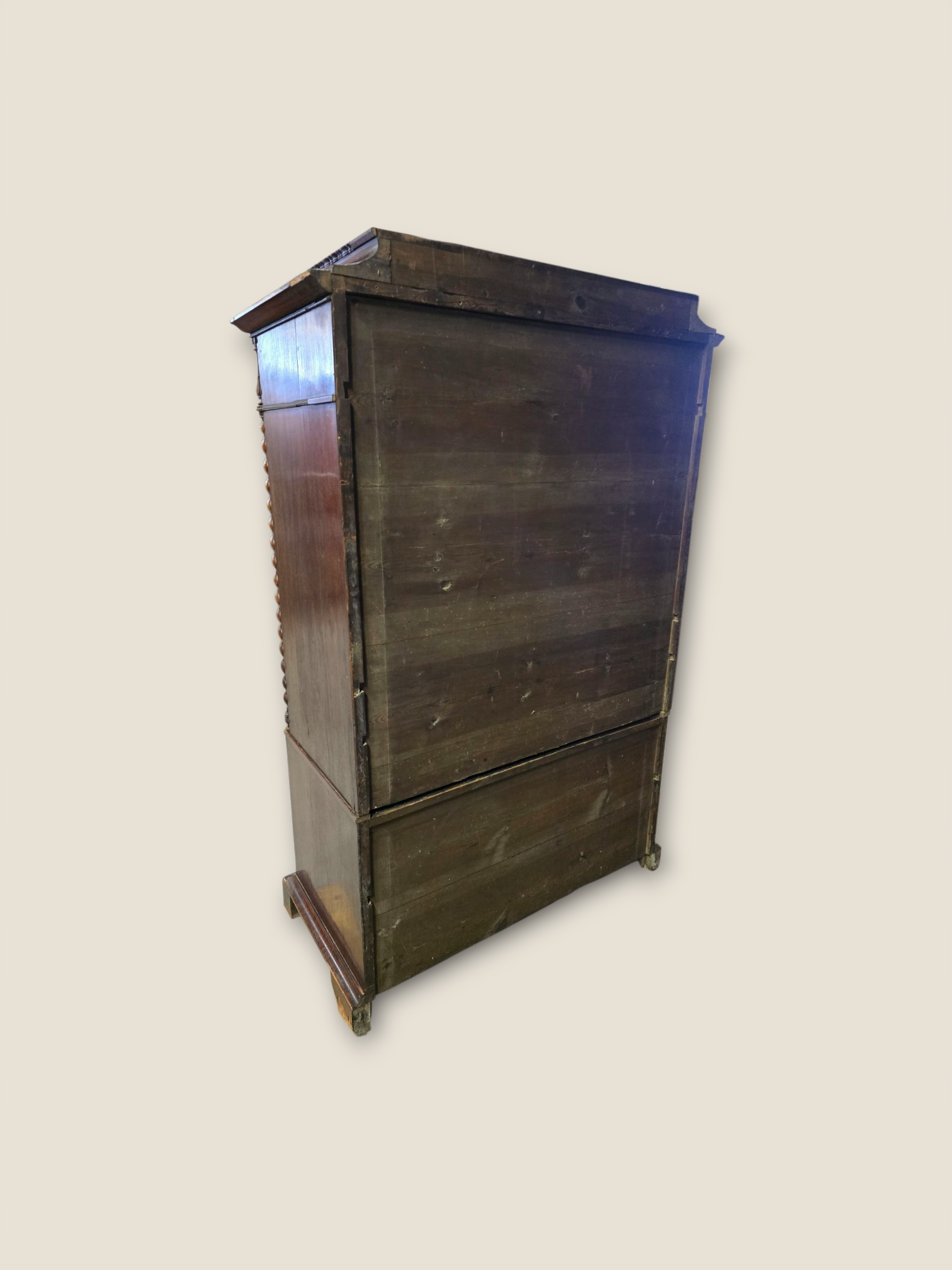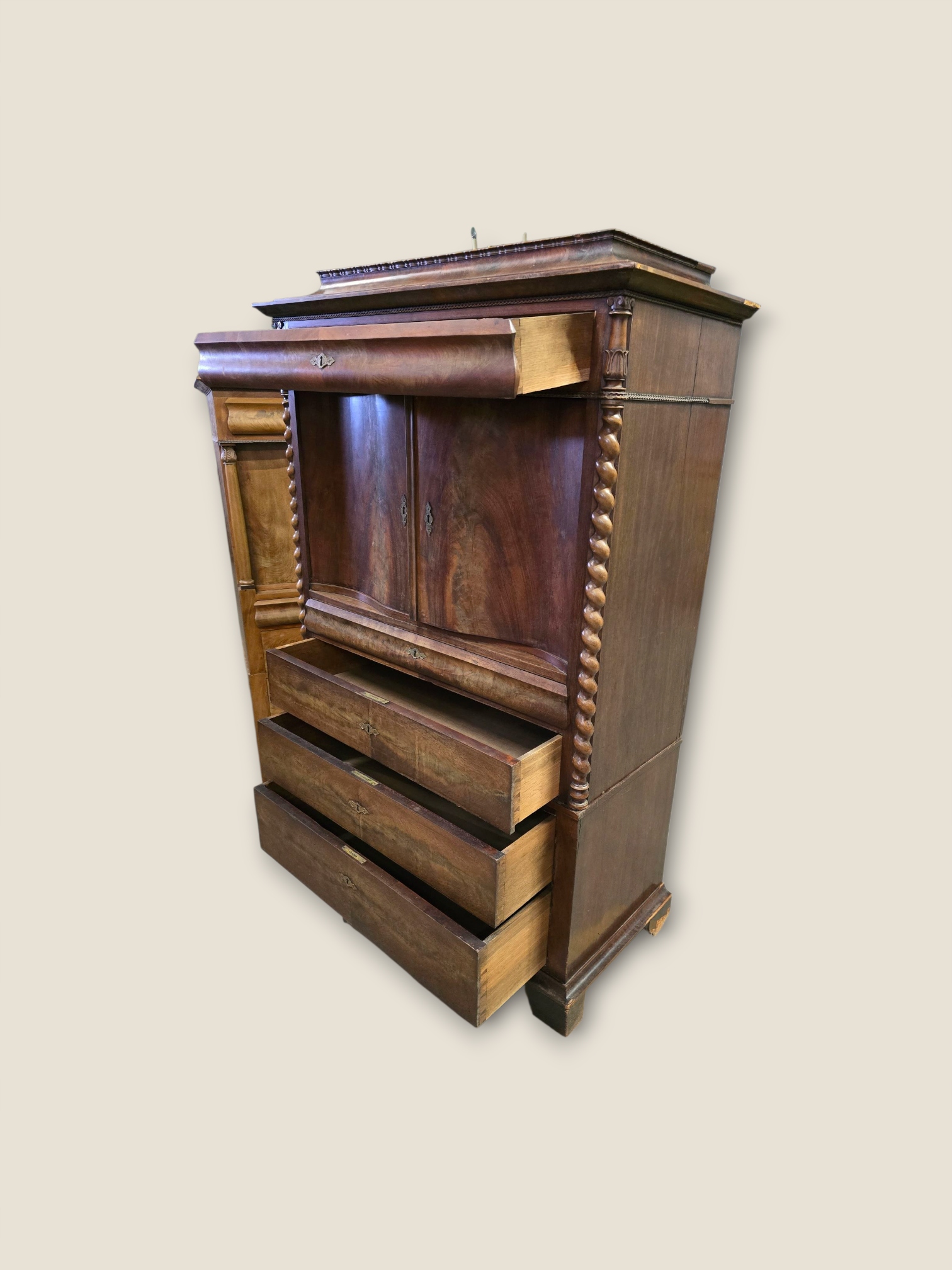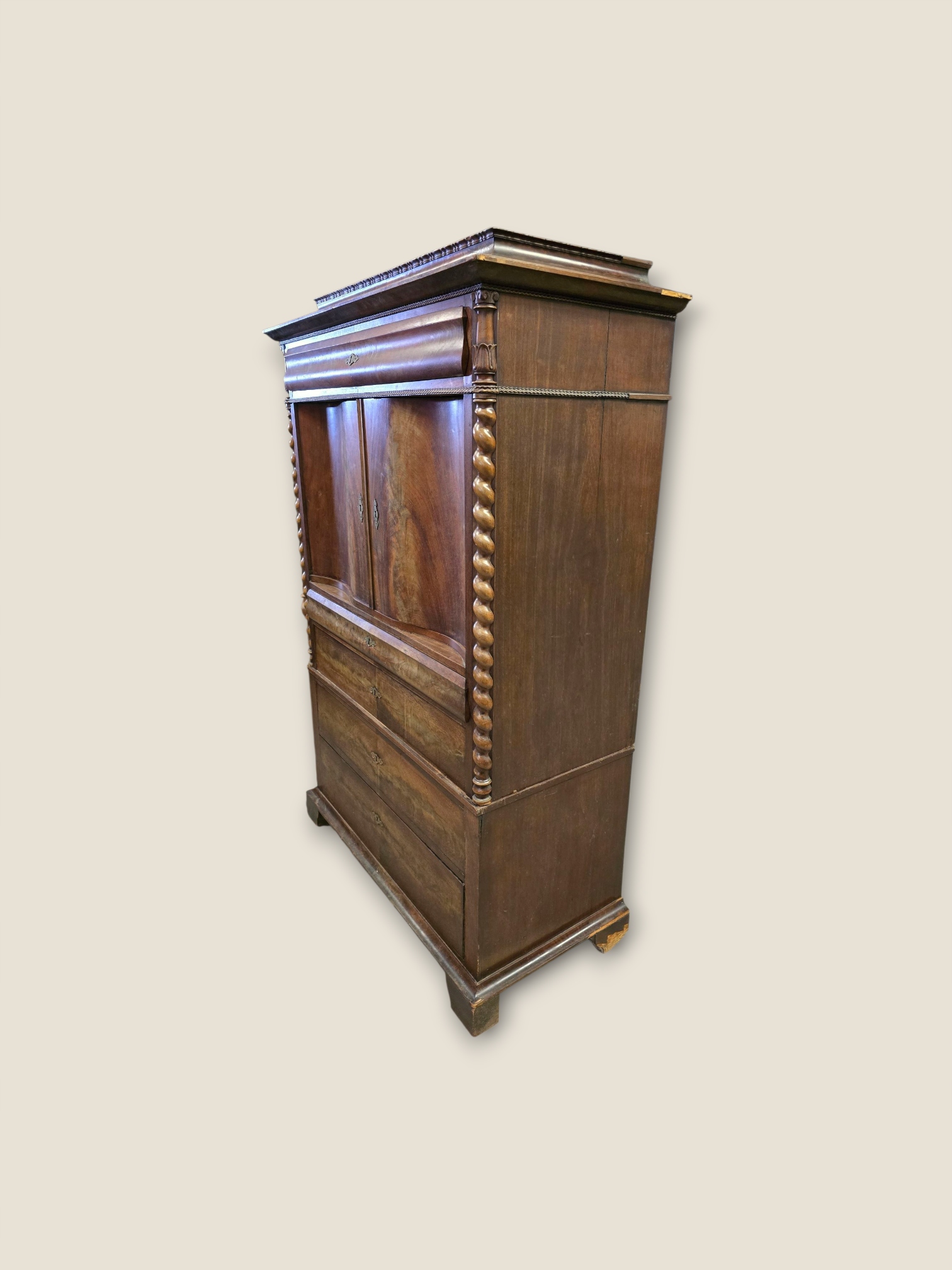 Предметом продажи является уникальный бар-секретарь из красного дерева первой половины XIX века. Мебель изготовлена из сосны и дуба, облицована пирамидальным шпоном красного дерева.