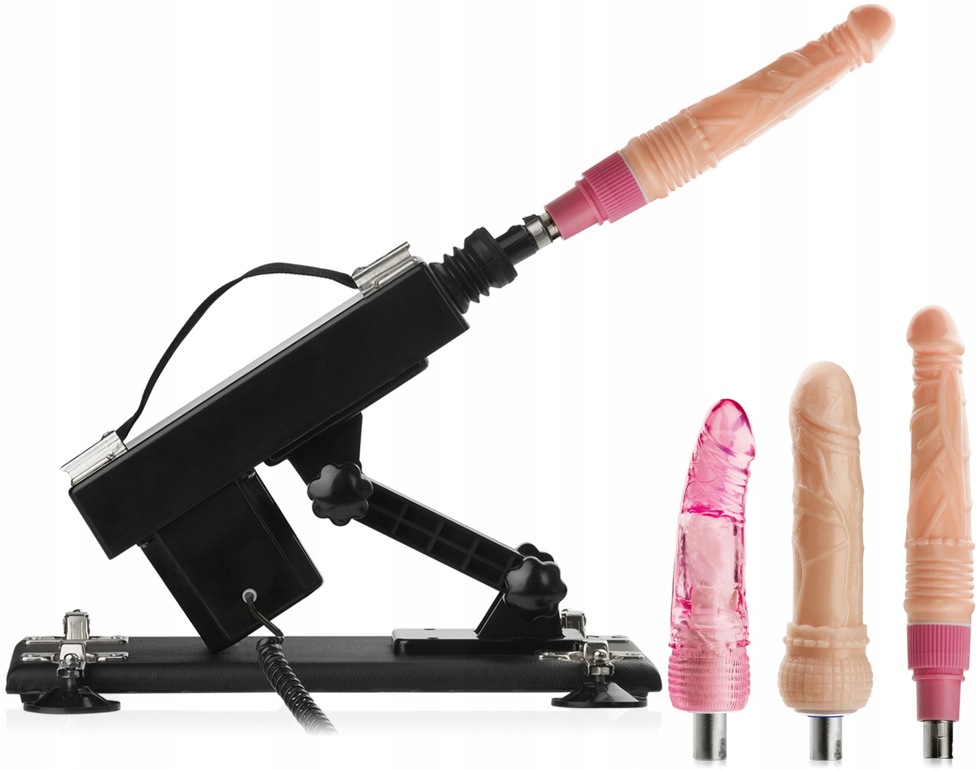Самая популярная секс-машина на рынке, бестселлер продаж в США под названием «SEX MACHINE», набирающая все большую популярность в Европе. Машина предназначена для женщин и мужчин с высокими требованиями, которые хотят интенсивной стимуляции и незабываемых впечатлений. Благодаря плавному регулированию интенсивности толчков вы сами решаете, насколько сильно вы хотите развлечься и как быстро хотите достичь оргазма. Вы можете установить машинку под наиболее удобным для вас углом, а 4 прочные присоски удержат ее на месте даже при очень интенсивном проникновении. В комплект входят три разных фаллоимитатора с реалистичным внешним видом пениса, которые эффективно побалуют как влагалище, так и анус.