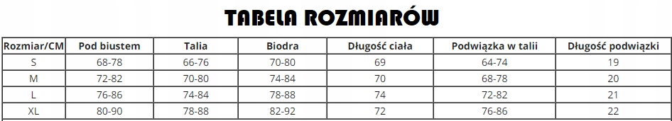 XL: под грудью: 80-90 см, талия: 78 -88 см, обхват бедер: 82-92 см, длина: 72 см, талия платья: 76-86 см, длина платья: 22 см.