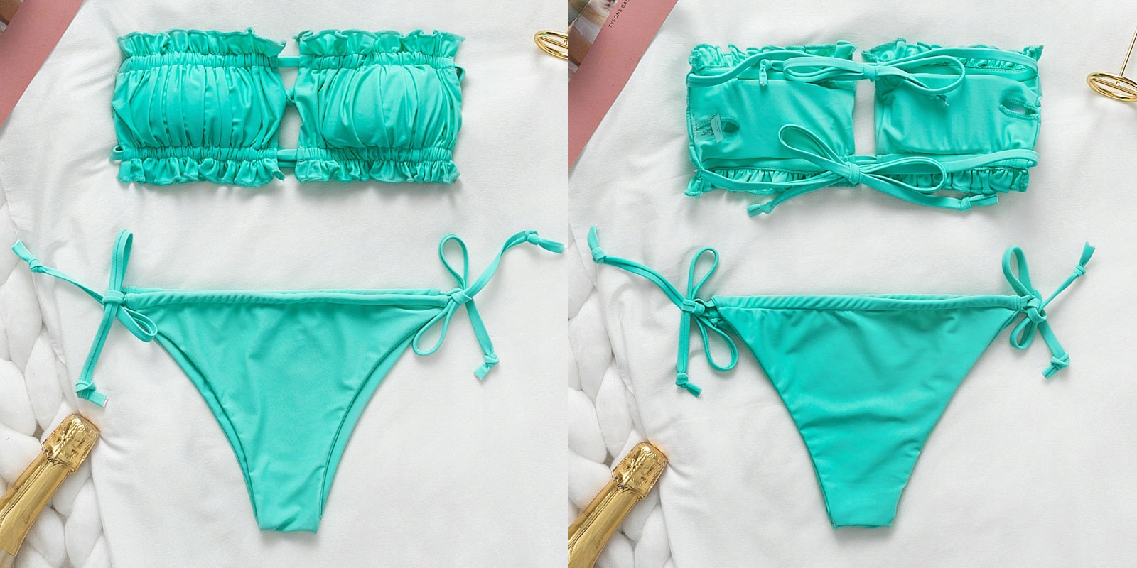 Женственный и невероятно сексуальный купальник, состоящий из топа и трусиков бразильского кроя на завязках.