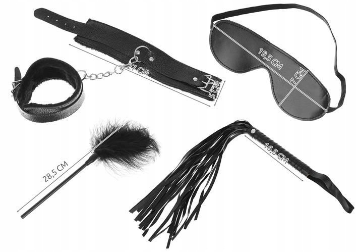 12 ЭЛЕМЕНТОВ - набор состоит из : 2 пары наручников на ноги и руки, толстая веревка, маска на глаза, ошейник с поводком, кнут, кляп-шар, ремни, соединяющие наручники, повязка на глаза, зажимы для перьев и сосков. Благодаря богатому содержанию он поможет вам избавиться от рутины в каждой спальне.