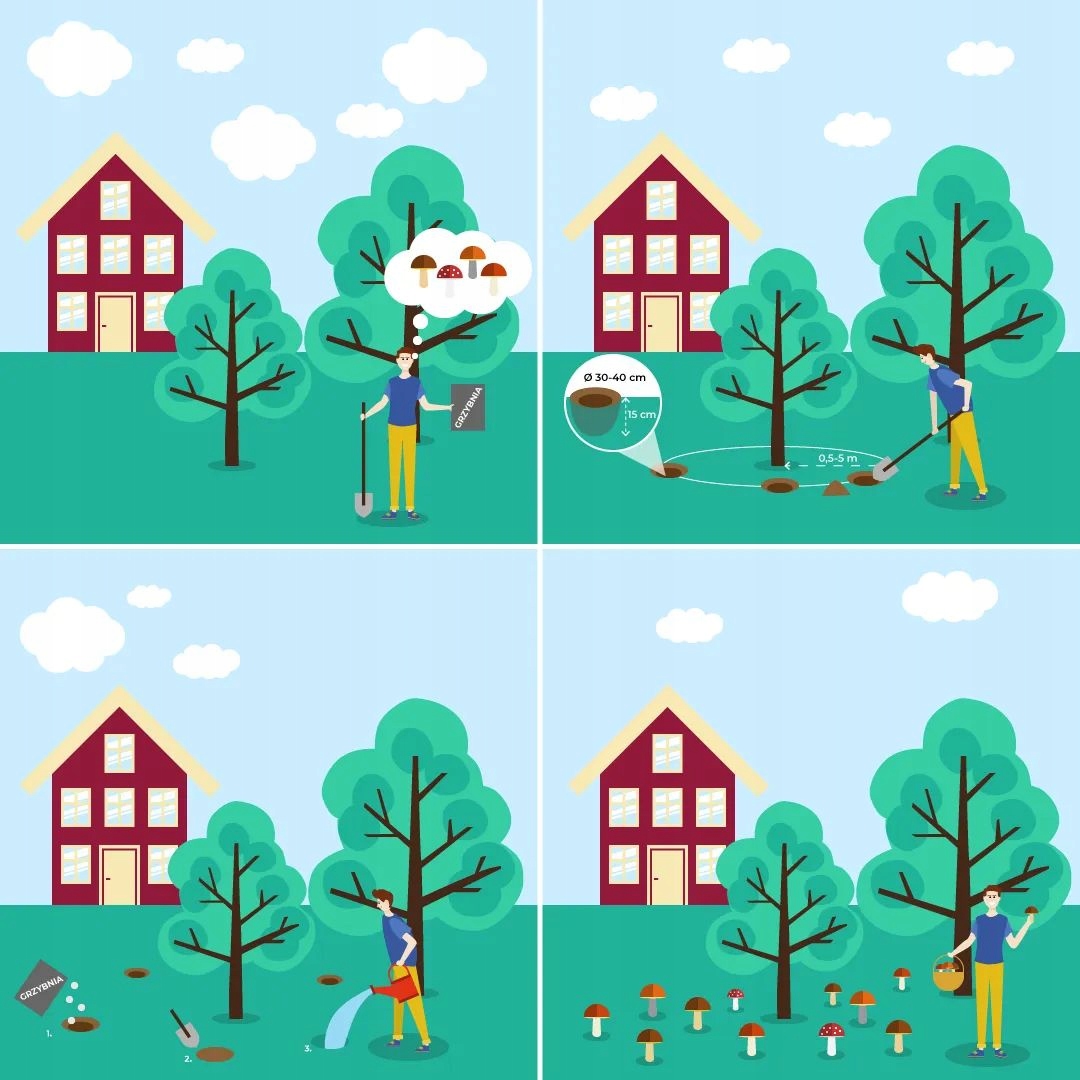 Применяйте мицелий с марта по октябрь. На месте нанесения грибницы должны расти хвойные или лиственные деревья, предпочтительно, если деревья относительно молодые; В качестве субстрата рекомендуется использовать готовую садовую почву с повышенным содержанием торфа.