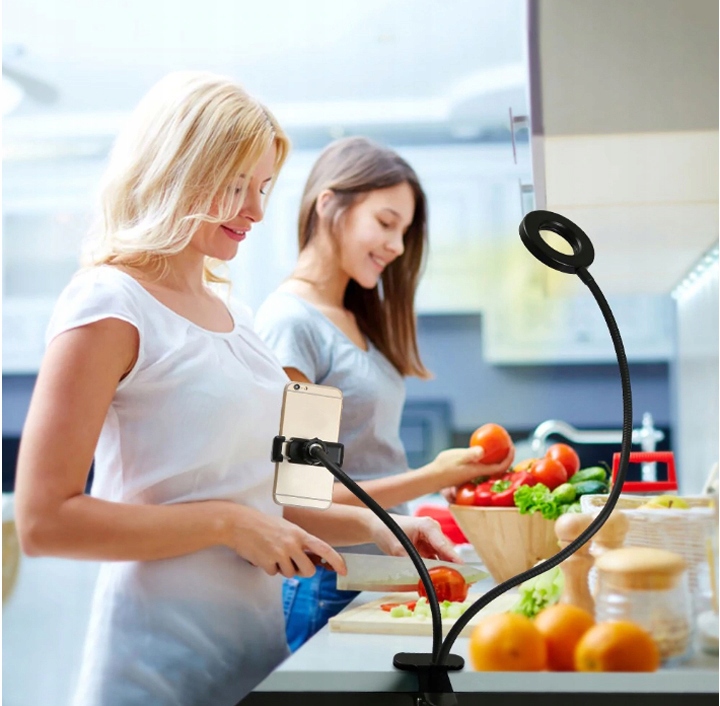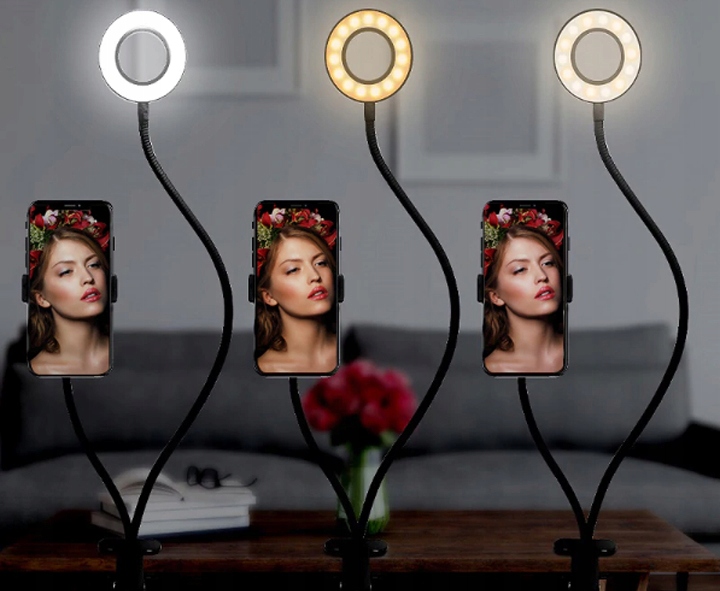 Кольцевая лампа 12 Вт с возможностью изменения цвета света, с держателем для телефона и гибким штативом с зажимом. Кольцевая светодиодная лампа идеально подходит для фотосъемки лиц, мелких предметов и макросъемки. Он отлично сочетается с макияжем и необходим в каждом салоне красоты. Лампа обеспечивает длительную, безотказную работу и отличную цветопередачу.