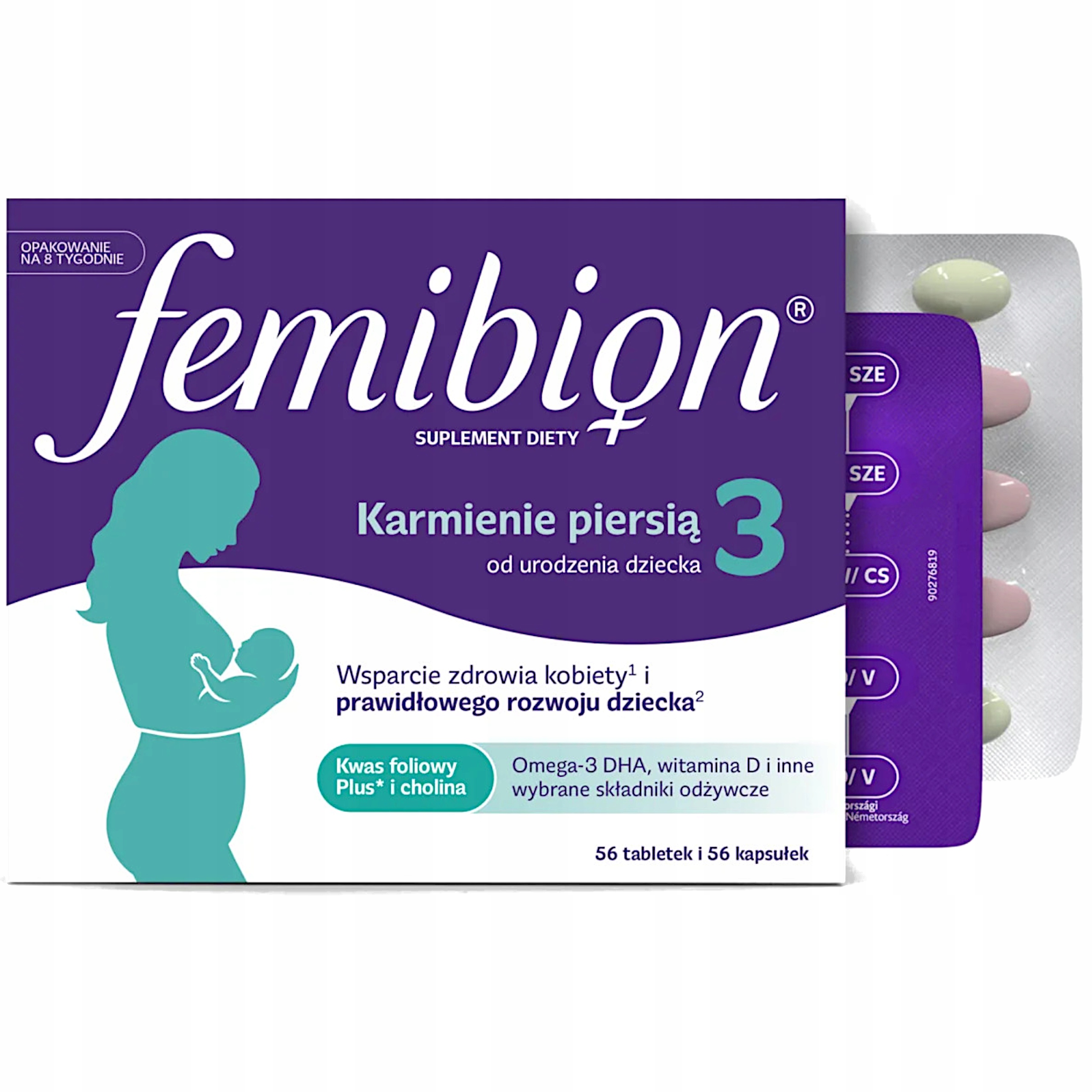 Фемибион 3 грудное вскармливание - это пищевая добавка, разработанная для удовлетворения потребностей женщин после рождения ребенка, который решил кормить грудью. Один препарат в двух формах: капсулы и таблетки позволяют доставлять организм в организм с большим количеством фолиевой кислоты, групповых витаминов В (B6, B12, рибофлавина, тиамина, пантитеновой кислоты), витаминов A, C, D, E, минералов (селен, цинк) и необходимой неатгуляционной жирной кислоты из-за семейства omeg-3. Формула была дополнена холином, который считается витаминовым веществом из -за его значительного биологического значения.