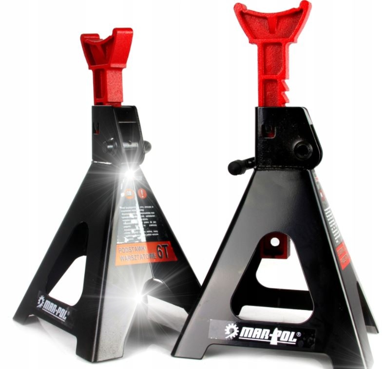 Стенд обеспечивает безопасную и стабильную поддержку автомобиля на специально профилированных седлах. Блокирующий рычаг эффективно защищает опорные столбцы в выбранной позиции. Они изготовлены из прочной стали и характеризуются твердой, сварной структурой. Ноги на стойках имеют сварные, широкие ноги, стабилизирующие кобылу, находясь под нагрузкой.