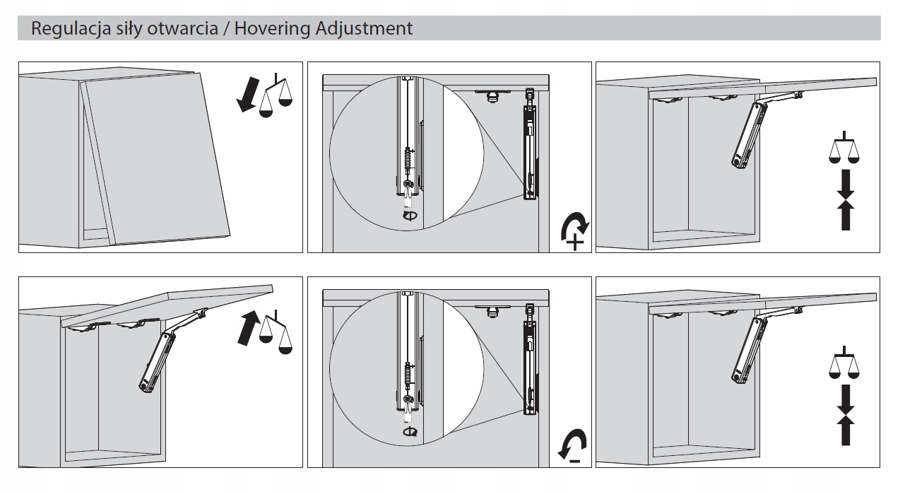 Во время открытия фронта ощущается минимальное сопротивление, затем его дальнейшая работа очень плавная, с возможностью остановки в любом положении, и после завершения действия система мягко и бесшумно закрывает фронт. Благодаря прямым привинчиванию, подгонка к боковой стороне тела очень стабильная и безупречно работает. Верхние подъемники универсальны и могут использоваться для всех обычно встречающихся высот и веса лоскута, а также в мебели с низкой глубиной