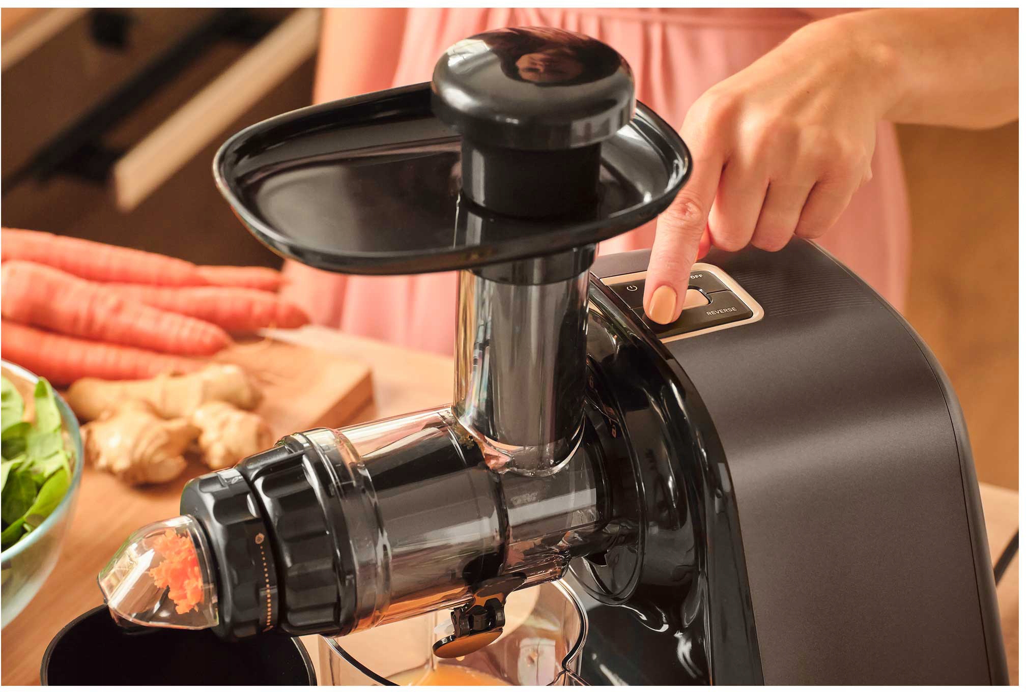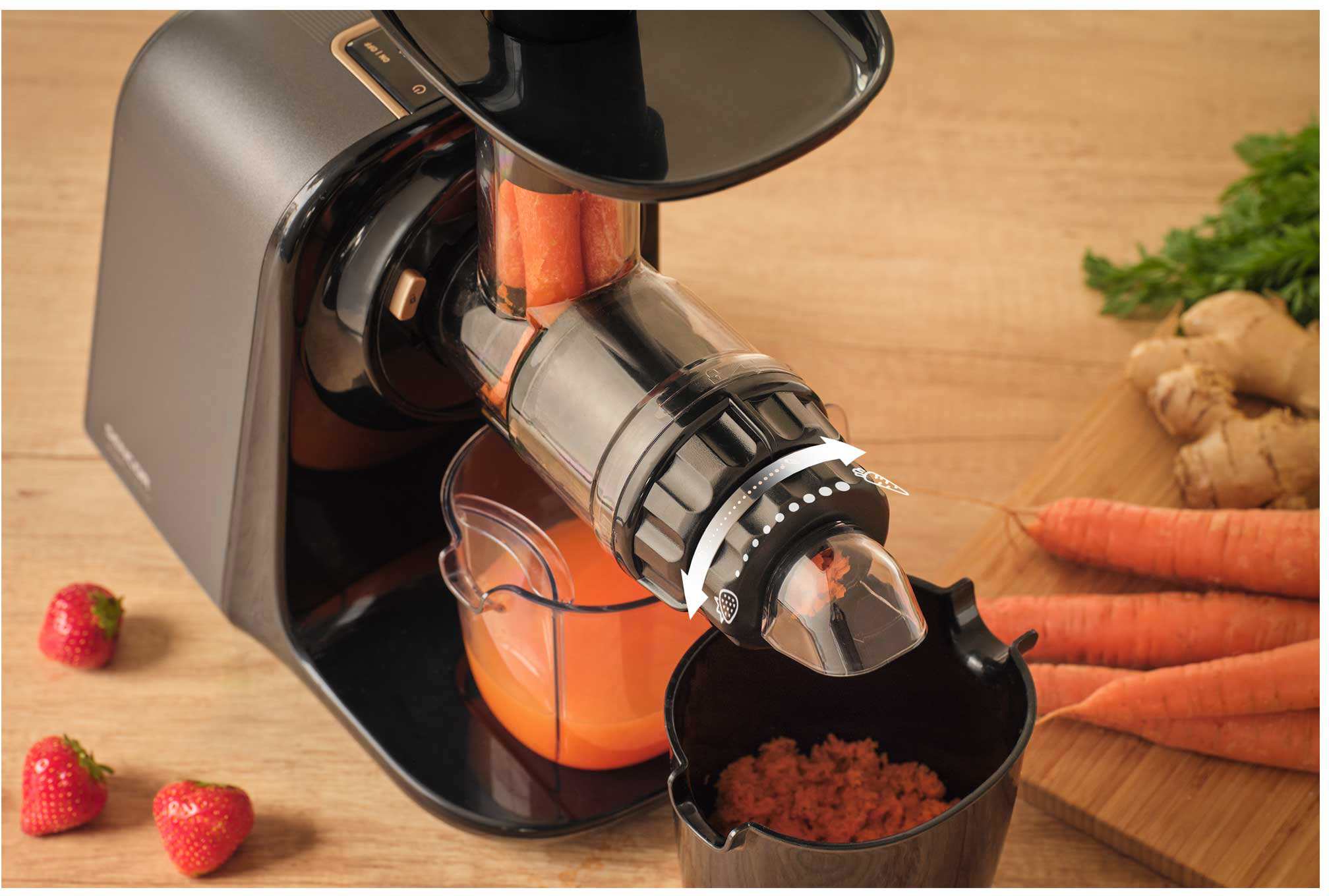 Технология медленного отжима | Двигатель постоянного тока мощностью 150 Вт | Регулировка количества мякоти и сока | Эффективное приготовление сока из фруктов и овощей | Сохранение витаминов и питательных веществ | Режимы SOFT (65 об/мин) и HARD (80 об/мин) | Легкая очистка – быстрая часть