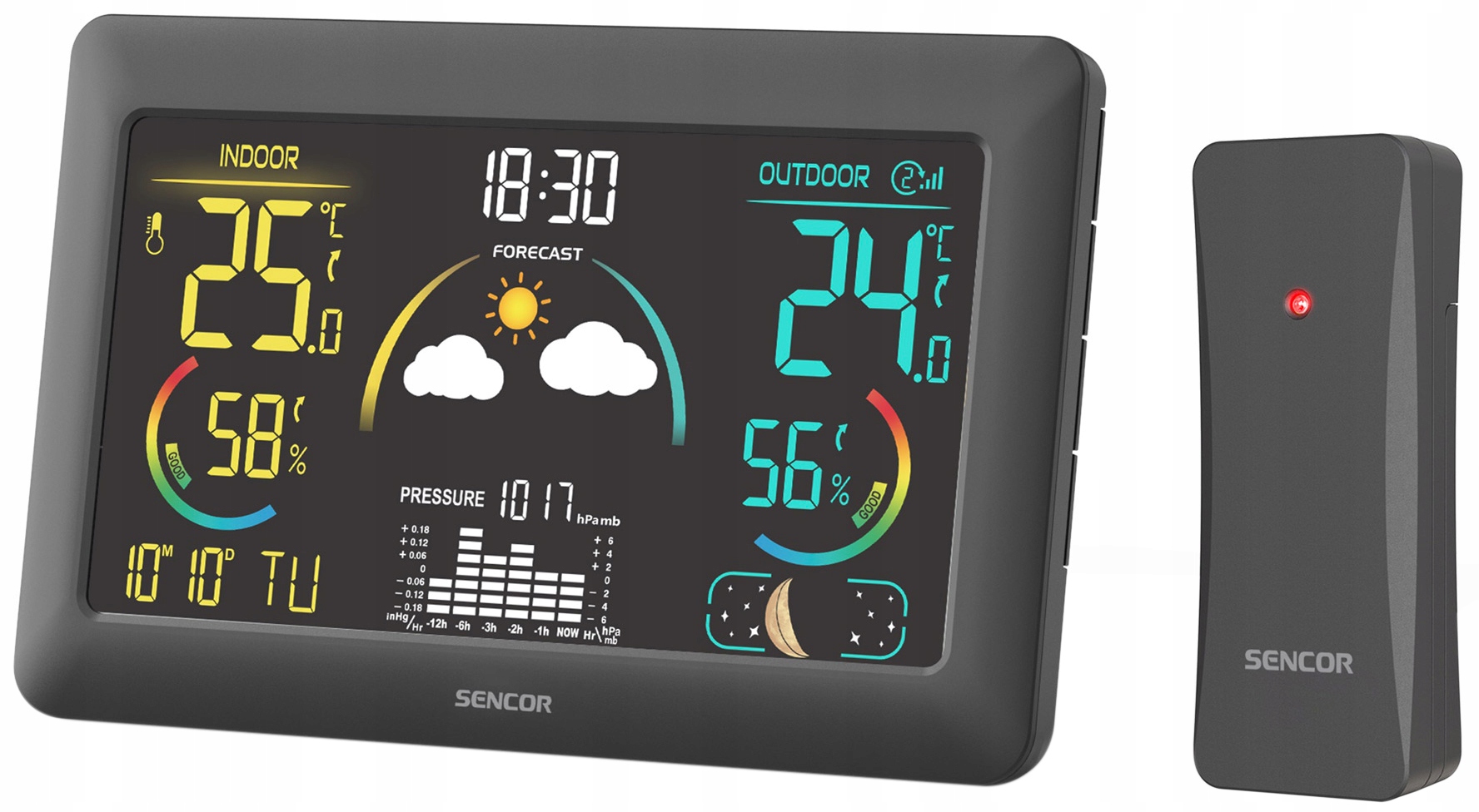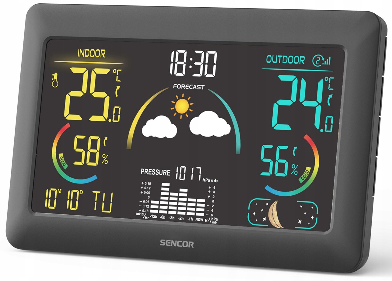 Метеостанция имеет дисплей даты (доступен 12-часовой и 24-часовой форматы времени), управляемый радиоприемником DCF77. сигнал. Вы можете настроить будильник на повтор и разместить станцию на прикроватной тумбочке, чтобы начинать свой день с прогноза погоды. Чтобы станция не беспокоила вас вечером, яркость можно приглушить. Вас также заинтересует значок фаз луны или время восхода и захода солнца. Метеостанция SENCOR станет приятным дополнением к любому дому.