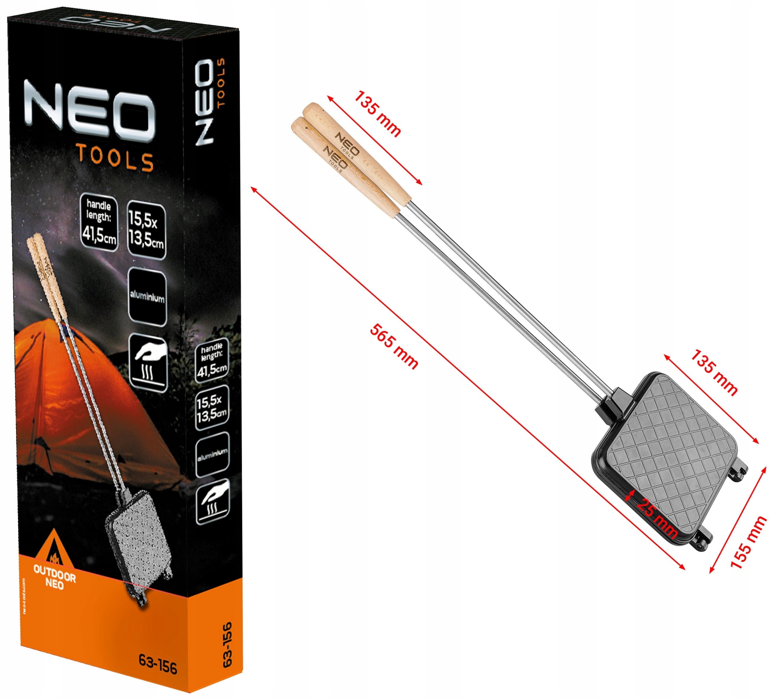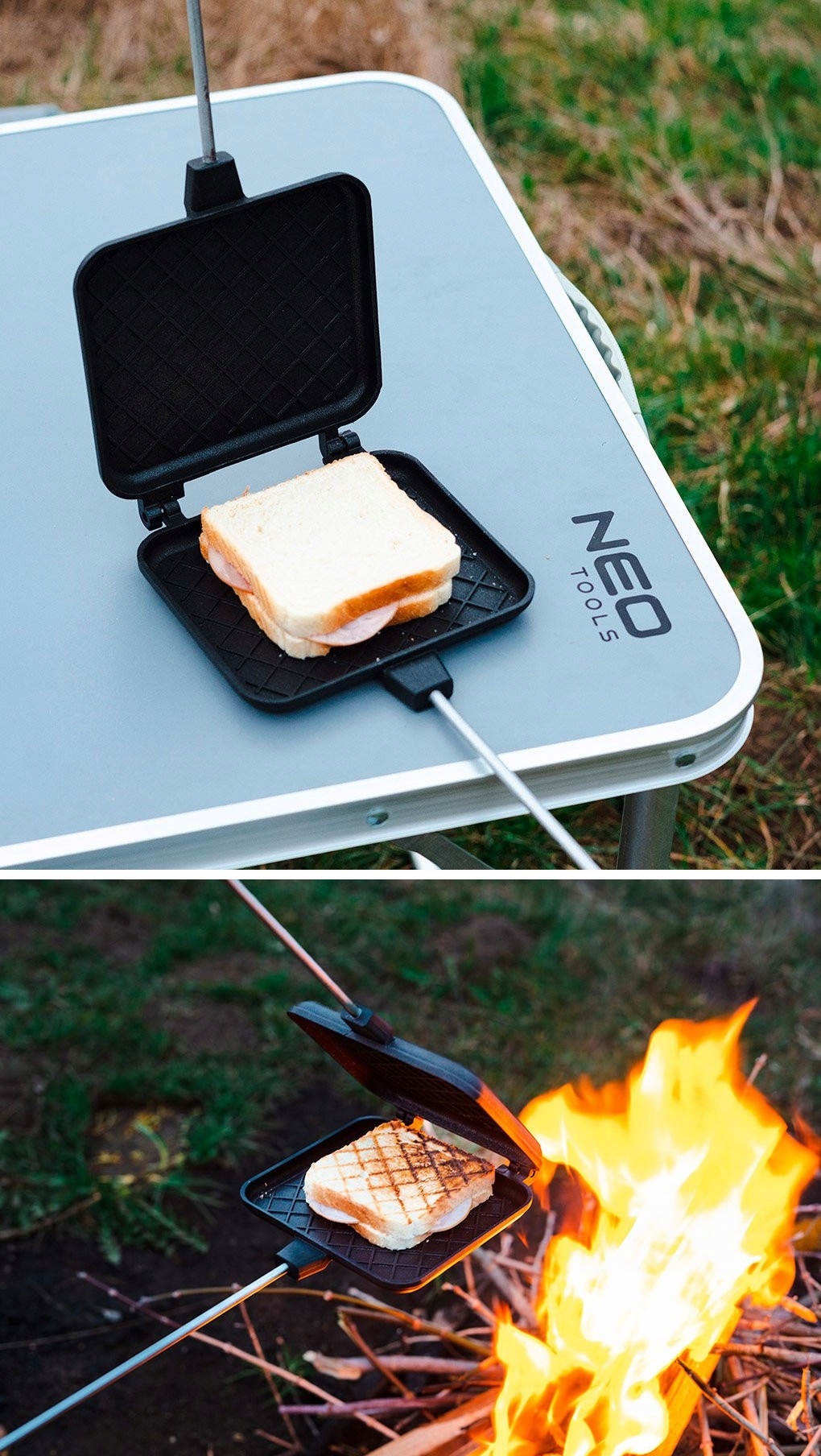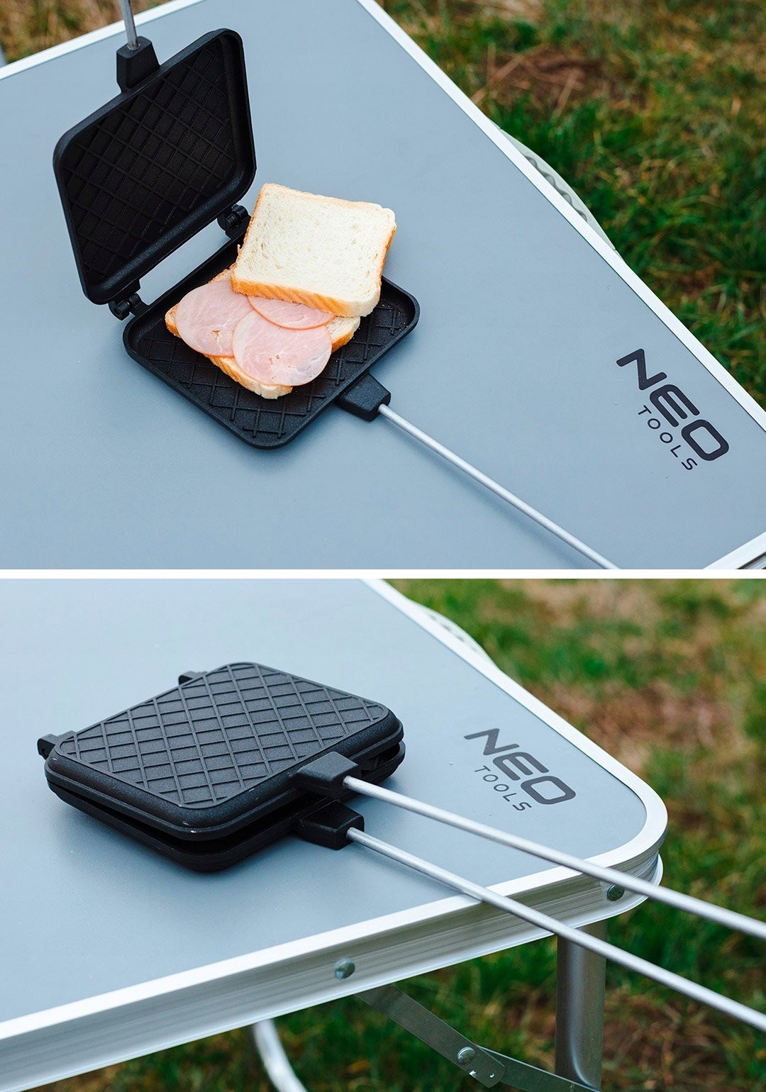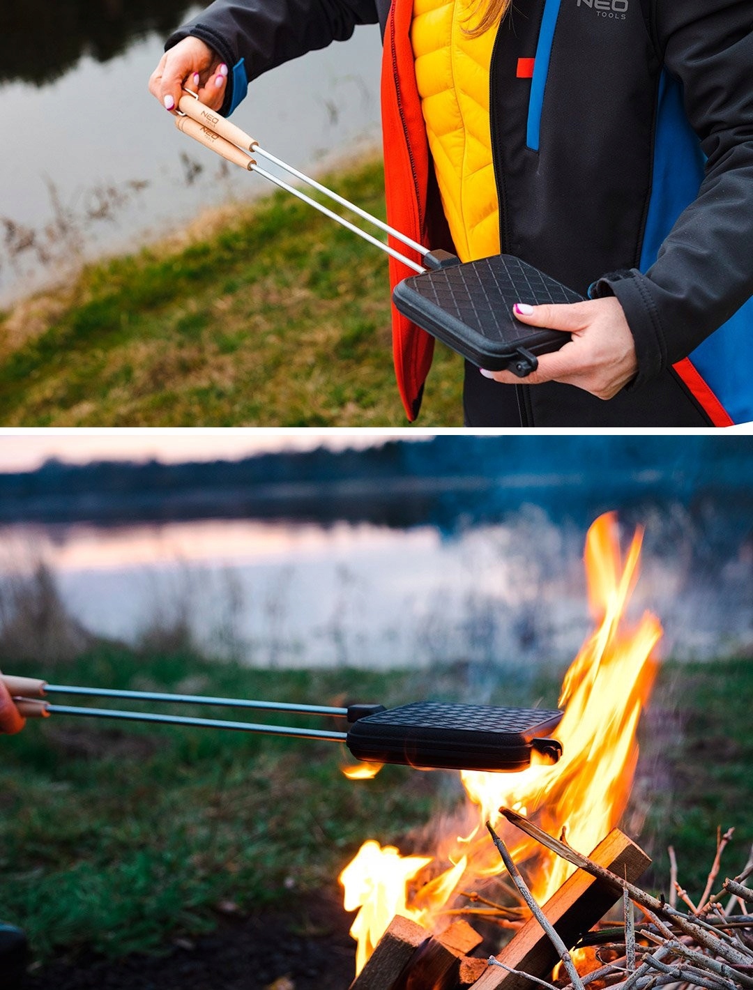 Универсальная сэндвичница для костра от бренда NEO — незаменимая вещь для каждого отдыхающего. Гаджет также отлично подходит для приготовления сырных тостов и яичницы на открытом огне. Его форма изготовлена из анодированного алюминия, устойчивого к истиранию и механическим повреждениям. Клетчатая текстура, в свою очередь, влияет на эстетические и вкусовые качества готовых закусок. Стержень из цинковой стали длиной 41,5 см обеспечивает необходимое расстояние от огня, сохраняя удобство использования тостера. Деревянные антибактериальные ручки удобно лежат в руках.