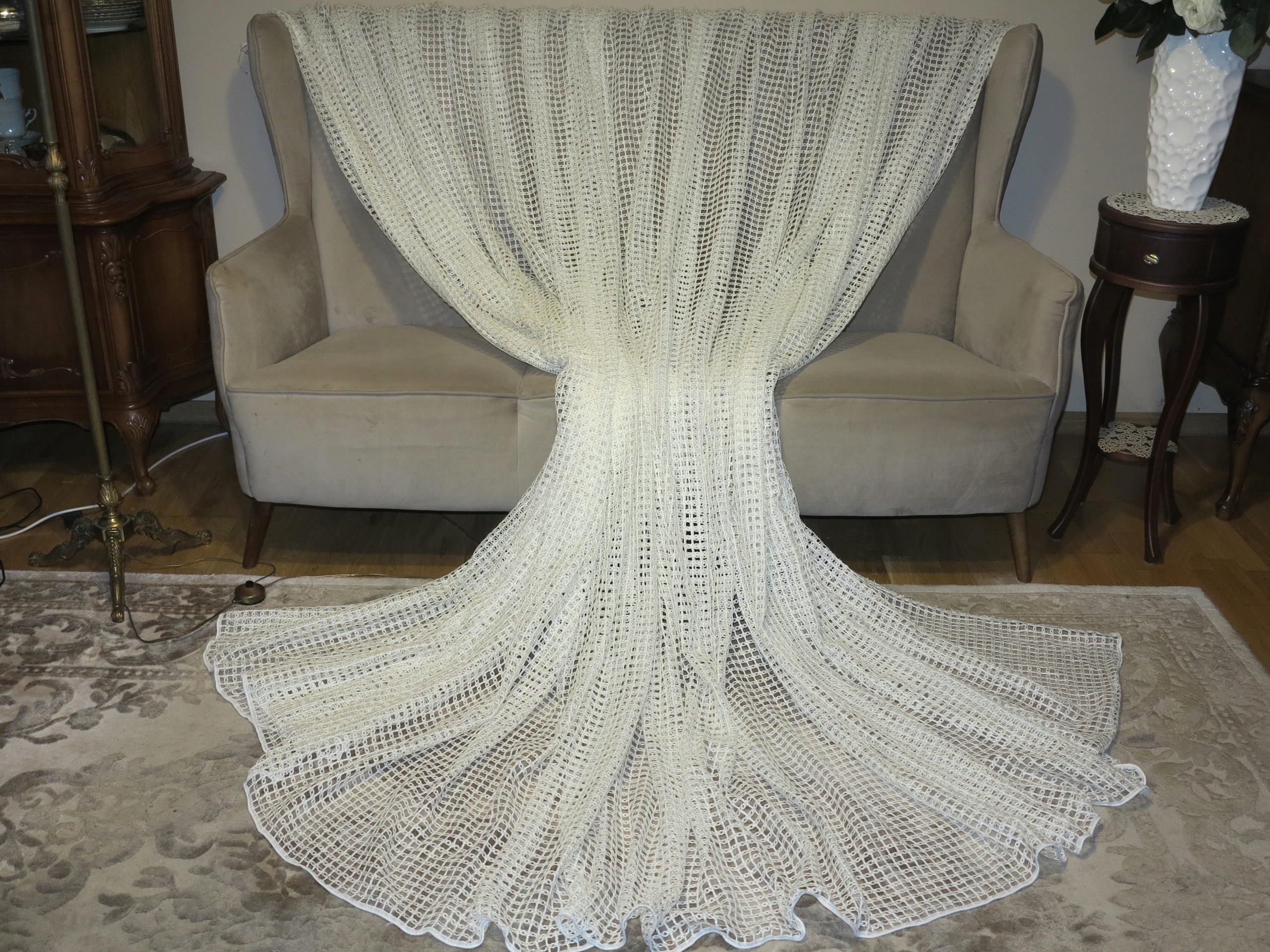 . Волейбольное кружево, очень удобное в использовании. Занавеска имеет сшитую кастрюлю. Занавес имеет размеры: ширина вниз 492 см, высота 255 см. Использовал занавес, но в супер хорошем состоянии. Я рекомендую, это выглядит красиво и очень оригинально. Я честно рекомендую.
