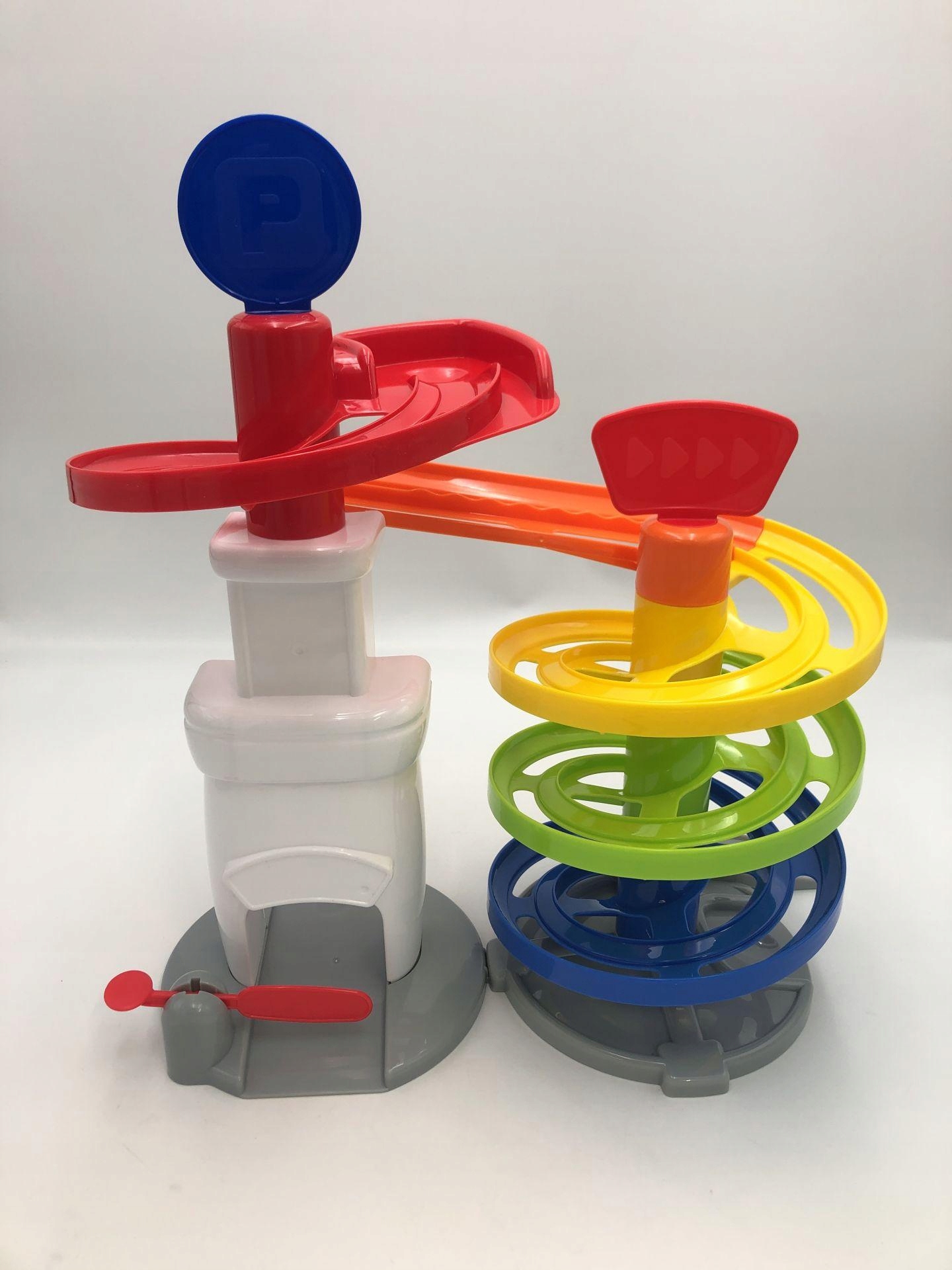 Горка с 4 уровнями: начинайте сверху, на каждом этаже Турбо-шар увеличивает скорость и приземляется на главной улице города. город