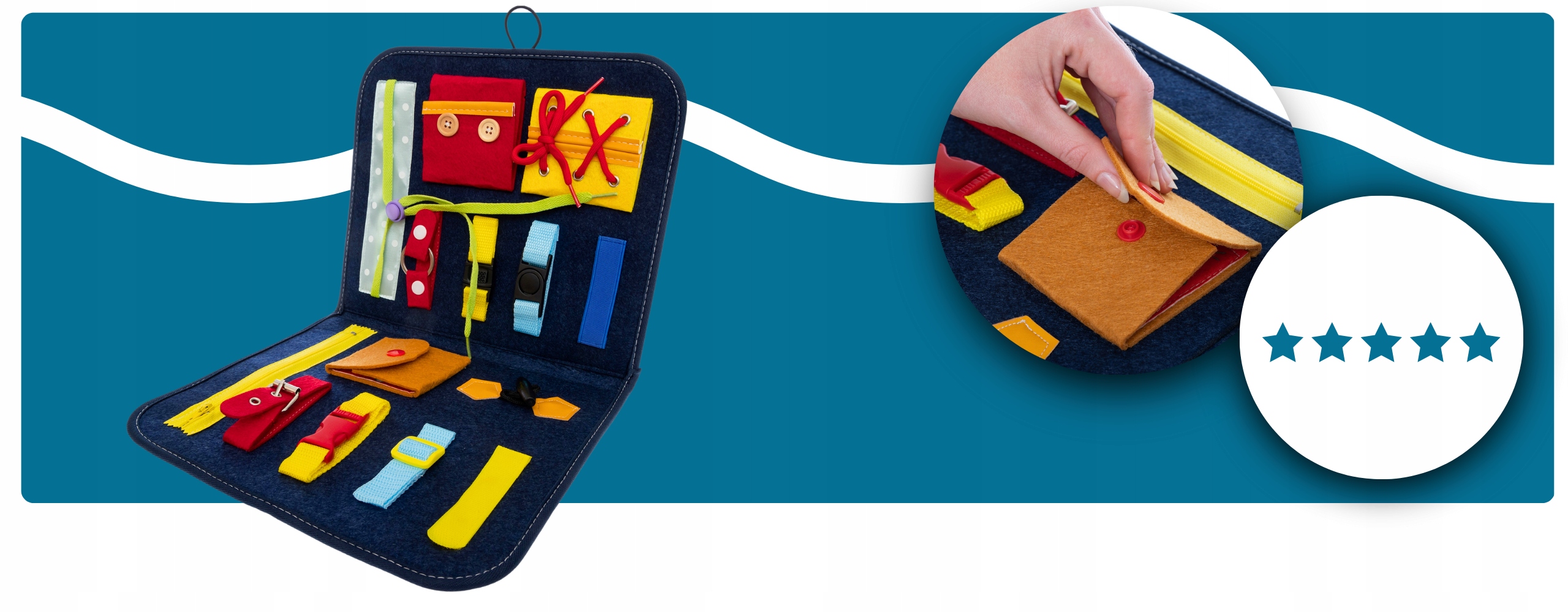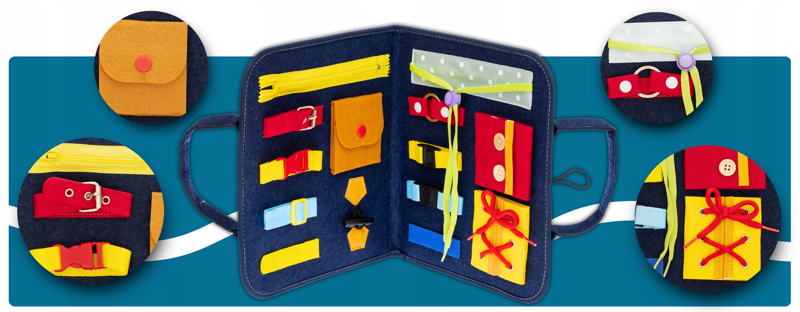 - Клазеры, пояс, молнии, пуговицы и кнопки: Учит самостоятельному одеванию и расстегивание одежды.