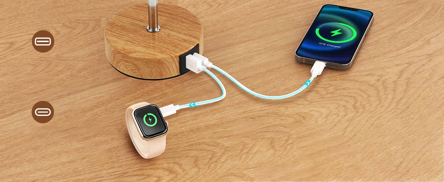 Ночник оснащен портами зарядки USB A и USB C (5 В/2,1 А), которые они могут быстро заряжайте устройства независимо от того, включен или выключен свет. Выходное напряжение безопасно и стабильно, поэтому устройства можно заряжать в течение ночи