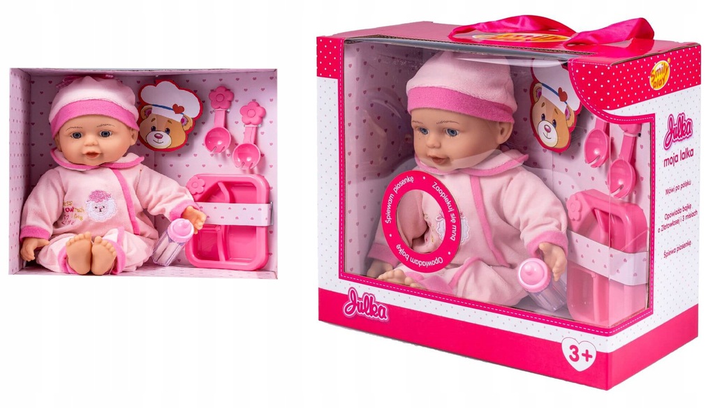 Кукла Юлька любит, когда о ней заботятся и кормят. Кукла одета в розовый комбинезон, имеет изысканную тарелку с весами, столовые приборы и бутылочку.
