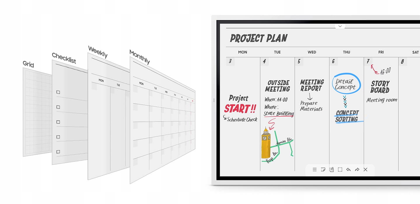 Благодаря встроенным универсальным шаблонам Samsung Flip 2 существенно облегчит повседневную работу. Множество вариантов персонализации идеально подойдут для вашего бизнеса. Вы можете использовать его для создания календаря, расписания занятий, блокнота, доски для отметки выполненных задач или загрузки любого шаблона.