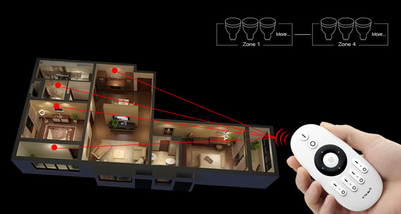 С помощью пульта дистанционного управления вы можете управлять и программировать освещение в четырех независимых моно-светодиодных зонах. Пульт дистанционного управления позволяет включать и выключать его, а также изменять интенсивность света. Множество приемников-контроллеров можно подключить к заданной зоне в пульте, что позволяет существенно расширить систему освещения.