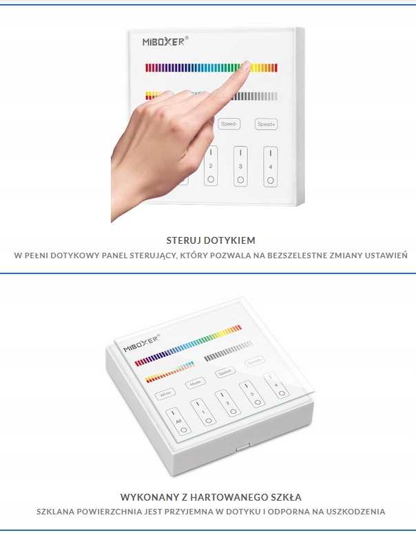 RGB+CCT Сенсорный контроллер Mi-Light B4-B Black LED — интеллектуальный контроллер, который позволит вам не только для управления светодиодным освещением переменного белого цвета, а также его разделения на 4 индивидуально управляемые зоны. На сенсорной панели вы найдете 4 кнопки выбора зон, с помощью которых вы можете включить или выключить тот или иной раздел, а также изменить цвет света, цветовую температуру и приглушить или увеличить его свет с помощью трех основных ползунков.