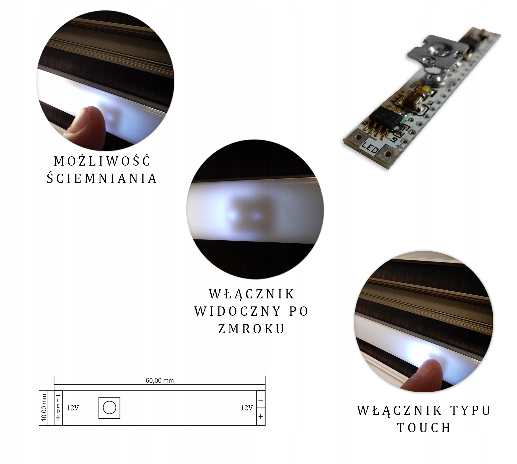 СЕНСОРНЫЙ переключатель с ШИМ-диммером 12/24В постоянного тока предназначен для одноцветных светодиодных лент. Выключатель подходит для монтажа на алюминиевые профили LUMINES с внутренними размерами более 10 мм. Выключатель можно установить в профиль за абажуром, благодаря особенности включения от прикосновения к пластине. Место, где находится табличка, освещается одним светодиодом