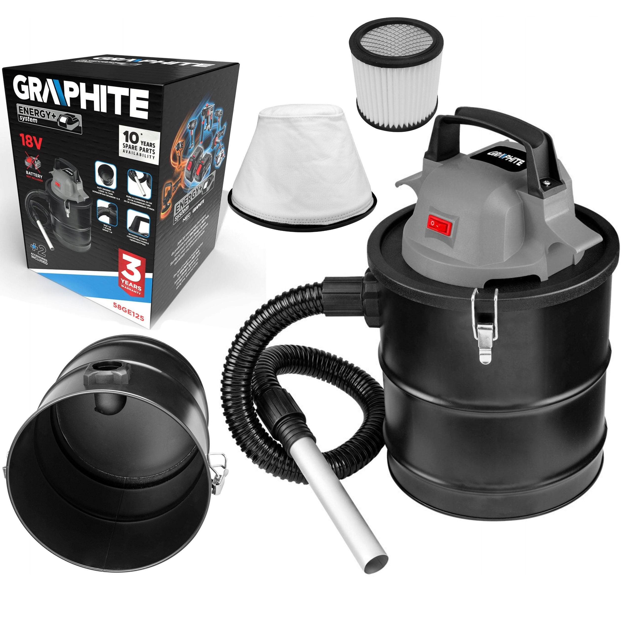Беспроводной пылесос для золы Energy+ 18 V 58GE125 от GRAPHITE с емкостью бака 15 литров. Он работает на основе аккумуляторной системы Energy+. Рекомендуемый аккумулятор – 4 Ач (время работы на 2 Ач примерно 17 минут). Устройство оснащено моющимся и многоразовым НЕРА-фильтром, а также тканевым фильтром, предназначенным для работы с пылью. Резервуар из нержавеющей стали рекомендуется использовать для хранения охлажденной золы от камина, барбекю или печи. Пылесос также хорошо справляется со своей традиционной ролью – для уборки дома, мастерской, гаража, подвала или котельной. Для всасывания гальки, песка и стружек. Имеет всасывающий шланг диаметром 30 см и длиной 1 м. Длина алюминиевой трубы составляет 20 см, а вместительный бак изготовлен из прочной нержавеющей стали. Пылесос работает при отрицательном давлении ?8 кПа. Его вес составляет 2,23 кг. Он обеспечивает удобство использования, в том числе благодаря удобной ручке для транспортировки. Марка GRAPHITE рекомендуется для длительного использования.