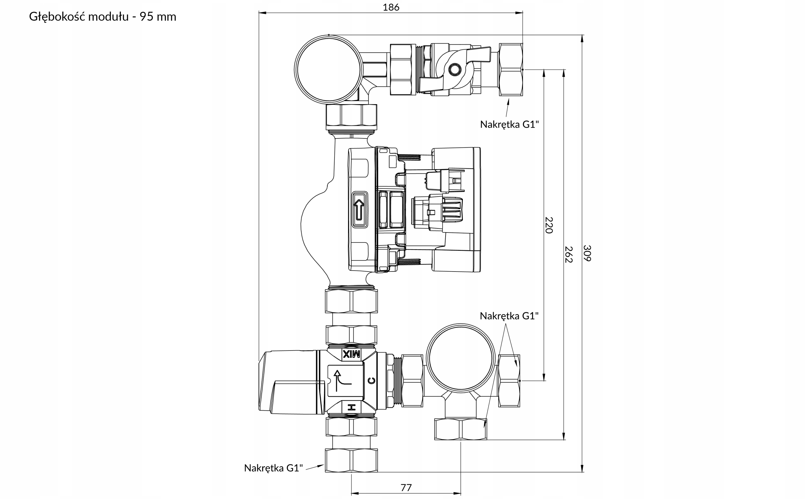 4. Термостатический клапан с ручкой для ручной регулировки температуры среды в контуре, с ниппелем 3/4" и разъемом PEX 3/4 x 16 (для AL PEX fi 16). труба).Клапан адаптирован к узлу привода.