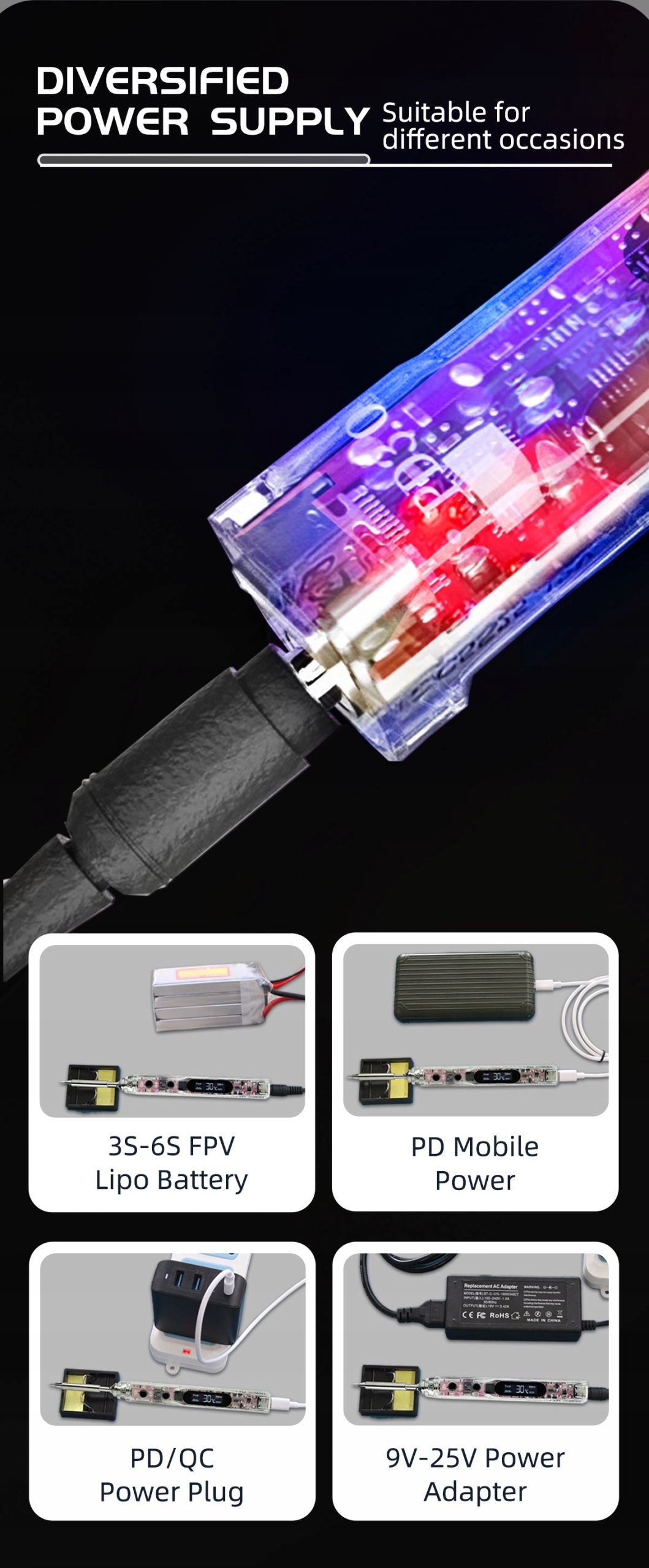 - источник питания: паяльный железо поддерживает питание батареи 3S-6S и технологии PD (питания) и QC (быстрый заряд), которые позволяют его удобно использовать в различных ситуациях, оба, оба. дома и в поле