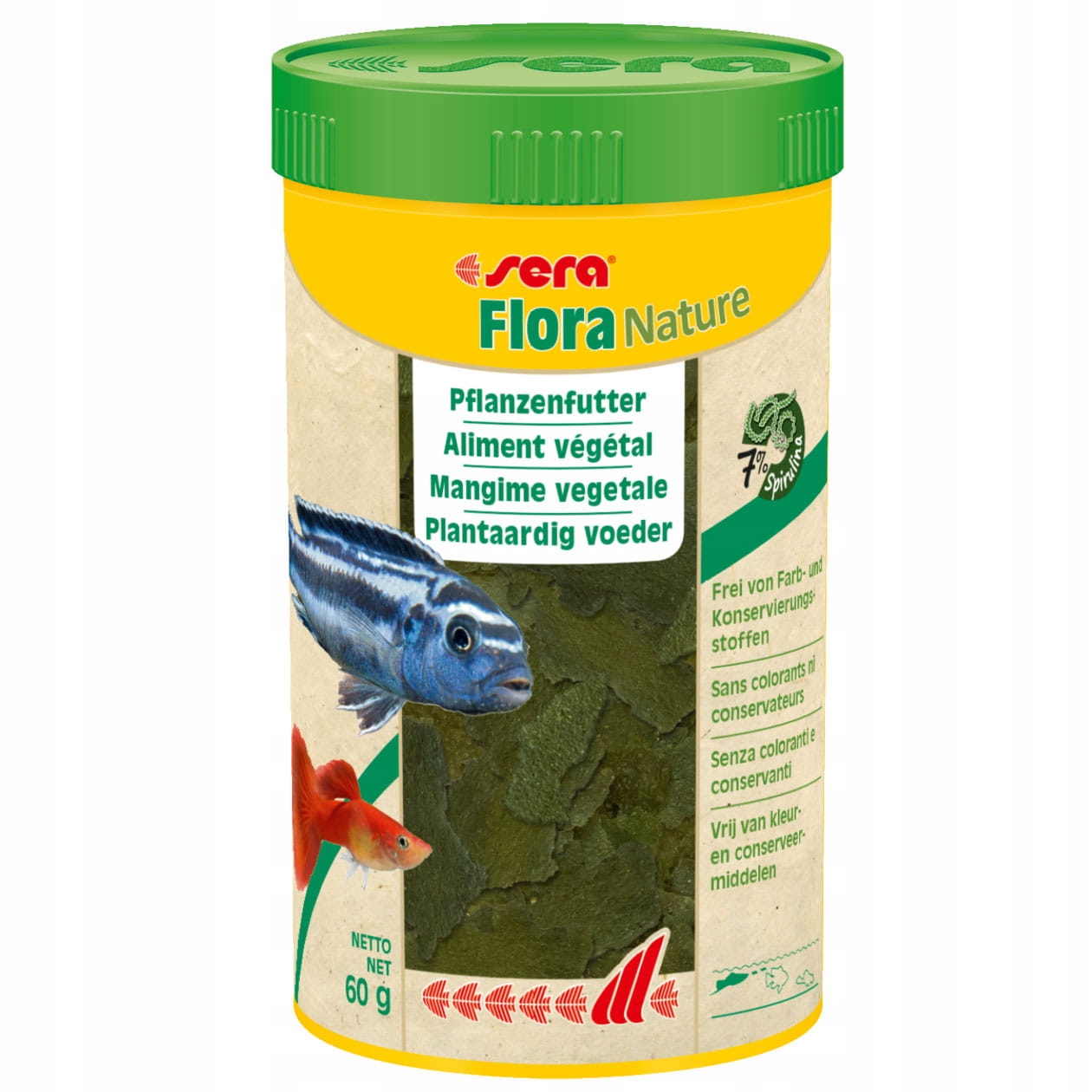 Sera Flora Nature — растительный корм для всех травоядных декоративных рыб, питающихся у поверхности воды, не содержащий красителей и консервантов.