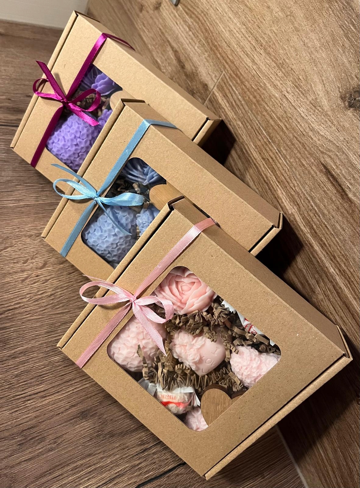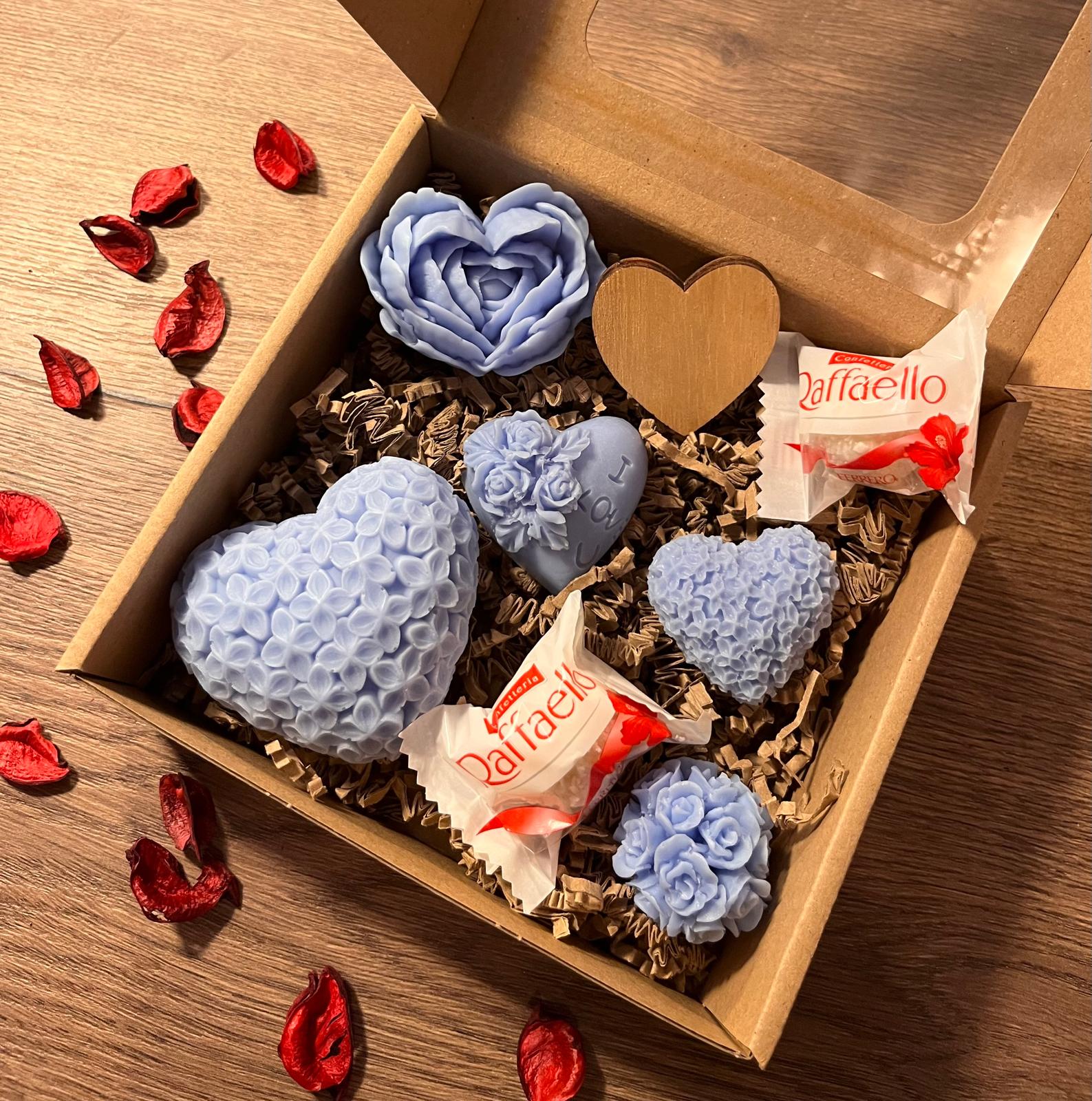 Подарочный набор с ароматными сердцами - уникальный способ выразить свои чувства! Каждое мыло не только очаровывает своей формой и запахом, но и скрывает сладкий сюрприз - пралине raffaello , который добавит подарок к еще большей уникальности! По случаю. Это незабываемый подарок