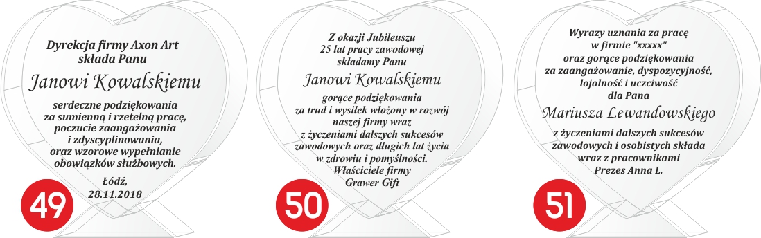 Красивое хрустальное сердце - благодарственное письмо выполнено с помощью технологии лазерной гравировки прямо на изделии. Хрустальная статуэтка выглядит великолепно благодаря своей классической форме. Статуэтка установлена на прочной основе из того же материала, которые постоянно соединены друг с другом. Гравировка выполнена на качественном лазерном плоттере. Это значит, что гравировка не отличается даже на нескольких купленных изделиях. Кроме того, он заполняется вручную и очень тщательно мастером заполняется специальной краской. Золотая или серебряная краска дает потрясающий эффект. Такого высокого качества вы не найдете больше нигде. Человек, получивший подарок, сделанный такого качества, обязательно будет рад, а вы будете гордиться тем, что смогли ему его подарить. Такого высокого качества обслуживания и поддержки вы не найдете больше нигде. Человек, получивший подарок, сделанный такого качества, обязательно будет рад, а вы будете гордиться тем, что смогли ему его подарить. Мы можем изготовить для Вас представленную статуэтку НА ЛЮБОЙ СЛУЧАЙ (свадьба, прием, крещение, причастие, день рождения, восемнадцатилетие, именины, юбилей, годовщина свадьбы, день матери и отца, день дедушки и бабушки, День Святого Валентина, День учителя и т. д.).