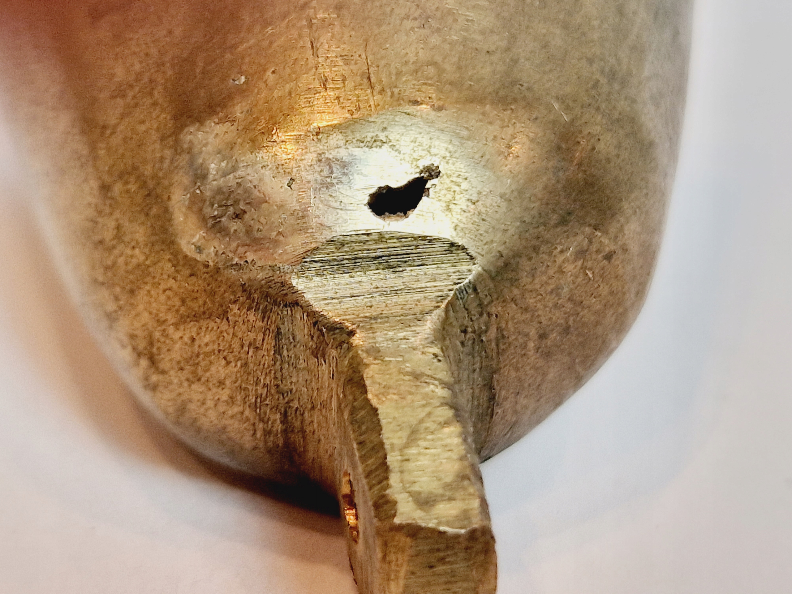 "Дырка" (производство) ) в корпусе звонка (у рукоятки) без какого-либо негативного влияния на его звук.