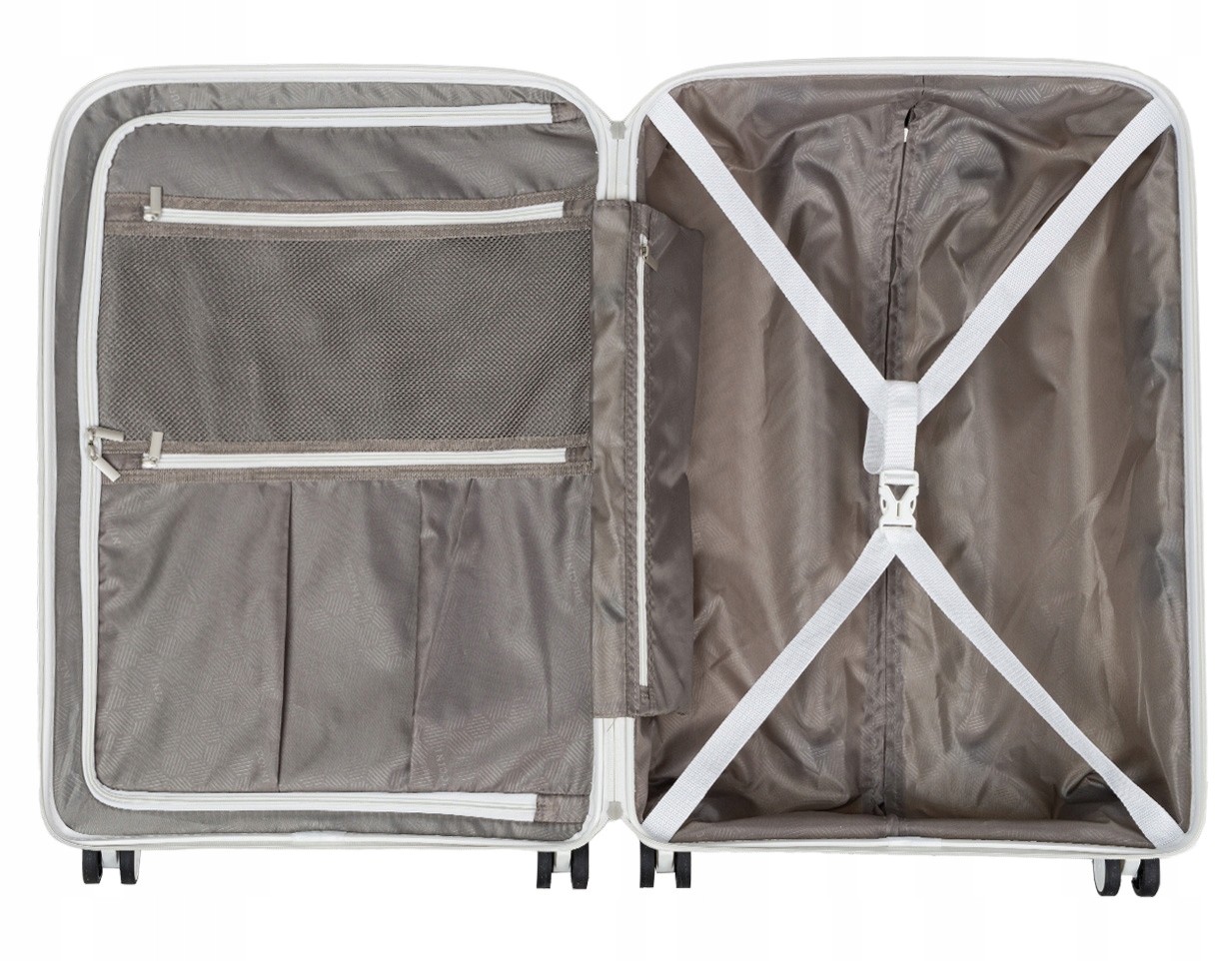 - Премни для крепления, карманы на молнии и перегородка между отделениямипозволяют сохранять вещи в чемодане в порядке и защищают одежда не мнется.