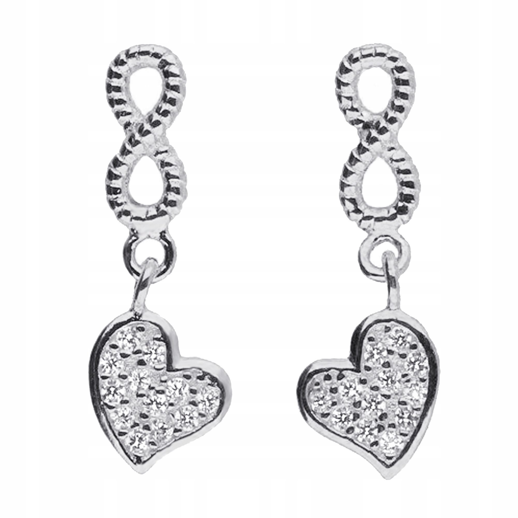 Небольшие серьги из серебра 925 пробы, покрытого слоем родия в форме бесконечности, с сердечками, усыпанными цирконами