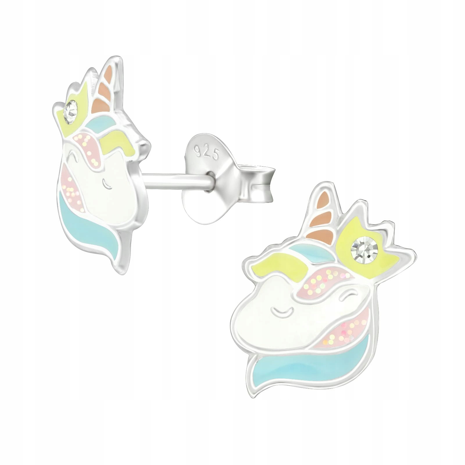 Милые серебряные серьги в форме единорога для девочки. Серебро 925. Единорог в белом, розовом, синем и желтом цветах с блестками, украшенными кристаллом. Вес 0,55 г, размер 7 мм х 10 мм, количество кристаллов 2 шт.