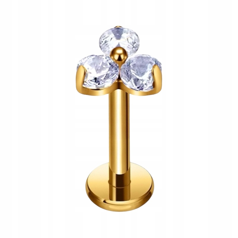 Эта уникальная сережка из лабра была сделана из титана и покрыта роскошным золотым покрытием, которое идеально сочетается с тремя блестящими цирконами. Их симметричное расположение создает форму, напоминающую цветок или трехлистного клевера, привлекая тонкий глазной блеск.